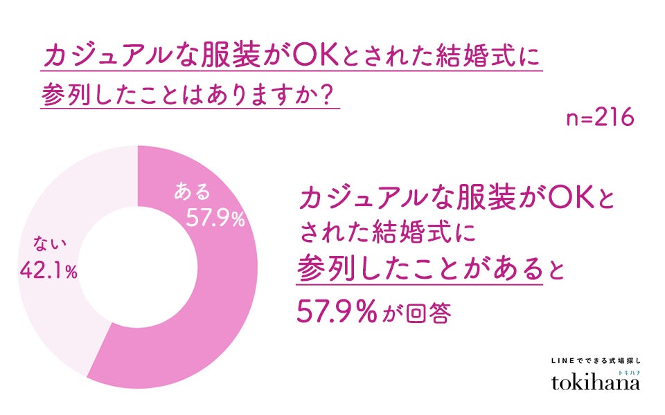 調査の結果、全体の57.9%がカジュアルドレスコードの結婚式に参列した経験があると回答しました。