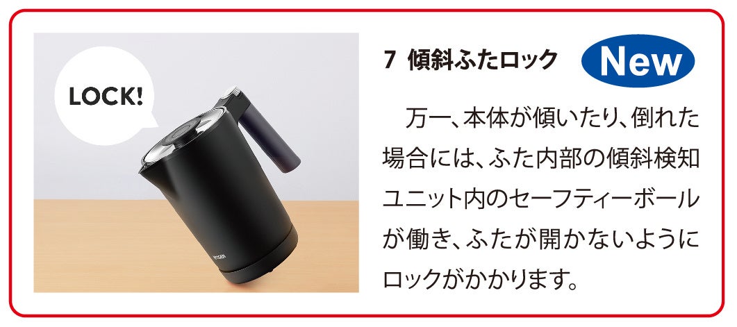 この度発売の新製品「PTQ-A100」は、新たに開発をした「傾斜ふたロック※1」を搭載。万一、本体が傾いたり、倒れた場合には、ふた内部の傾斜検知ユニット内のセーフティーボールが働き、ふたが開かないようにロックがかかります。「傾斜ふたロック」が加わることで、「PTQ-A100」は7つの安心・安全構造を搭載し、<7SAFE+>として、ラインアップに加わりました。