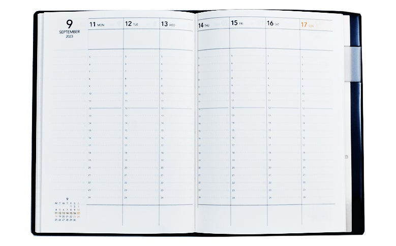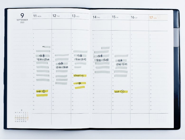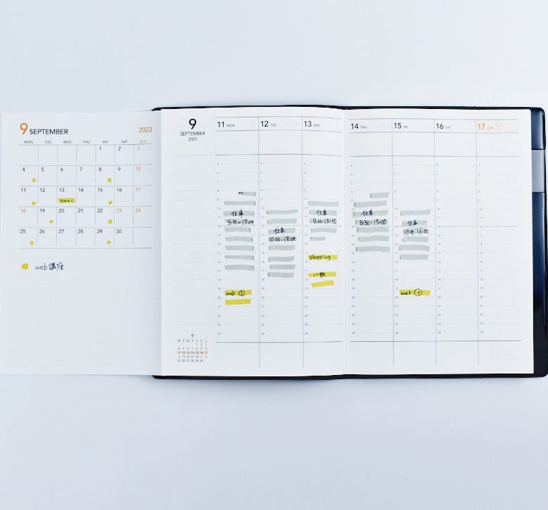月間カレンダーは折り畳み式。広げると月間の予定と1週間の予定を見開き1ページで管理できます。スケジュール管理が面倒という心理的な敷居を下げました。