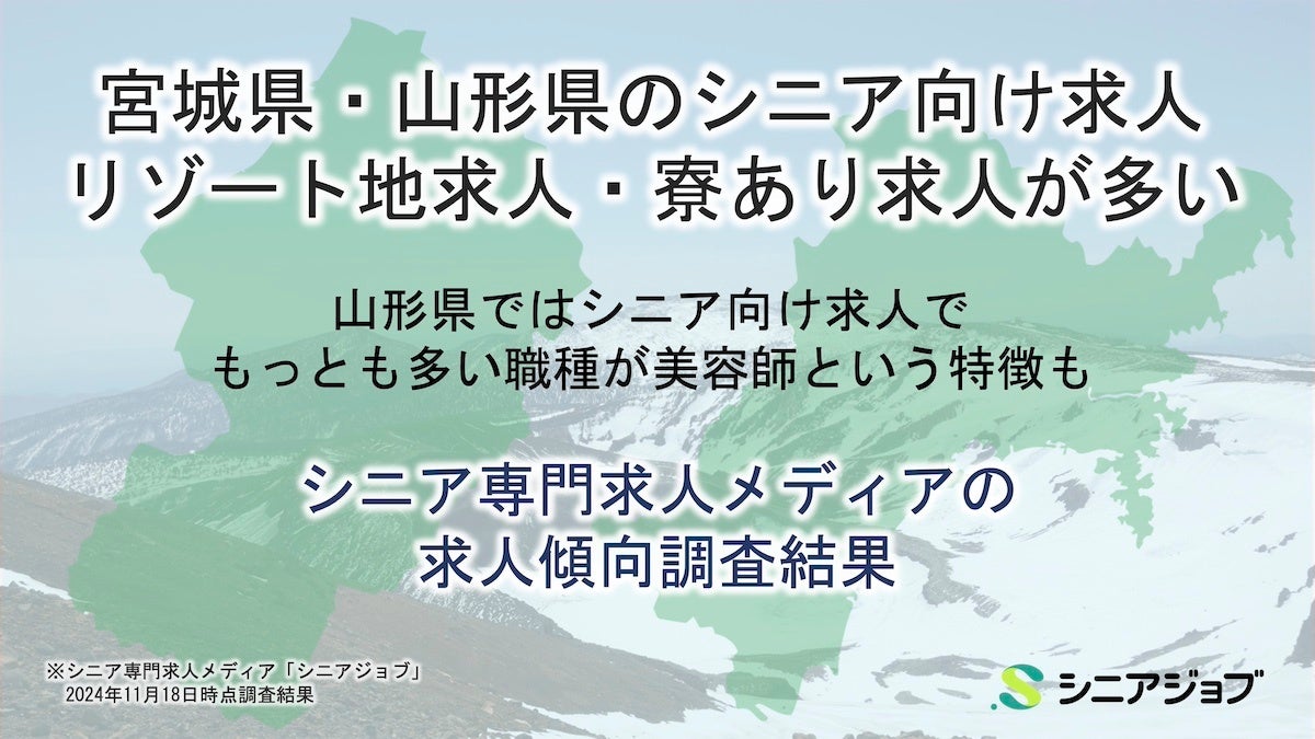 シニア転職支援の(株)シニアジョブ(本社:東京都新宿区/代表取締役 中島康恵/以下、シニアジョブ)は、サービス提供するシニア専門求人メディア「シニアジョブ」に掲載された宮城県と山形県の求人についての傾向調査結果を発表しました。2024年11月18日時点の宮城県と山形県のシニア向け求人を、全国や東京都などと比較し、他の都道府県では最上位とならない「美容師・美容室」の求人が山形県の求人職種でもっとも多い、宮城県・山形県ともに北海道同様「リゾート地」「寮・社宅あり」の求人が多いといった特徴が見られました。