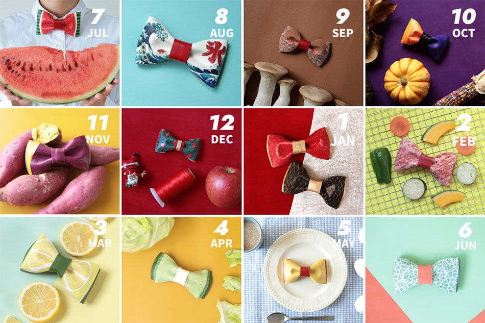 グルメレポーター彦摩呂さんプロデュースの「グルメな革の蝶ネクタイ」。毎月四季折々のグルメが蝶ネクタイとなって登場します。テレビの食レポで着けた姿が見れるかも?