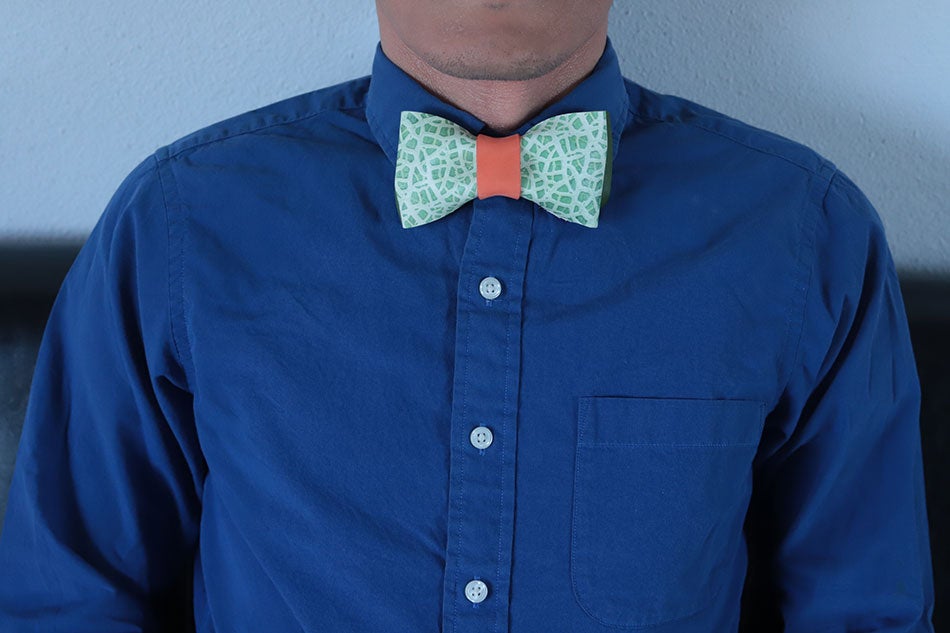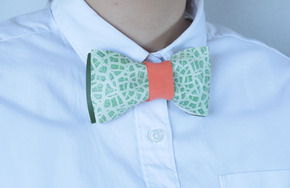 グルメリポーター彦摩呂さんと大阪のファクトリーブランド クアトロガッツの革職人がコラボした蝶ネクタイが登場。メロンの質感をレザーで再現しました。