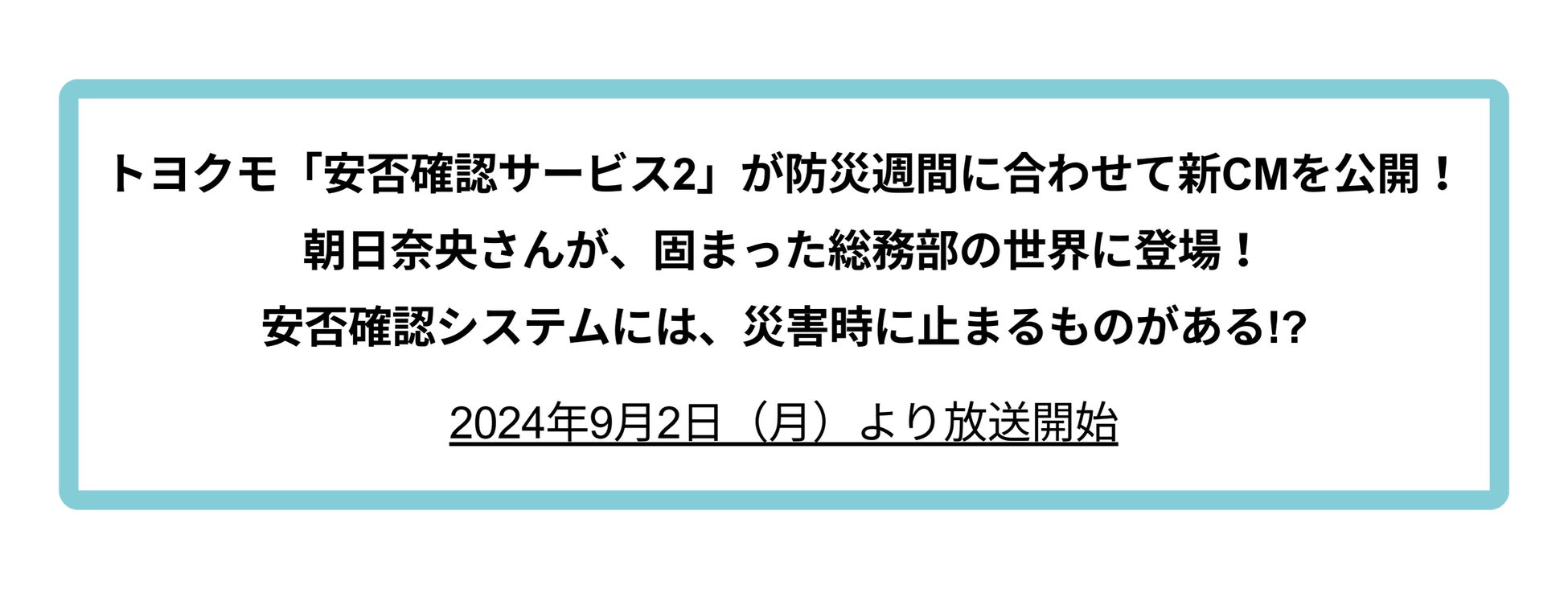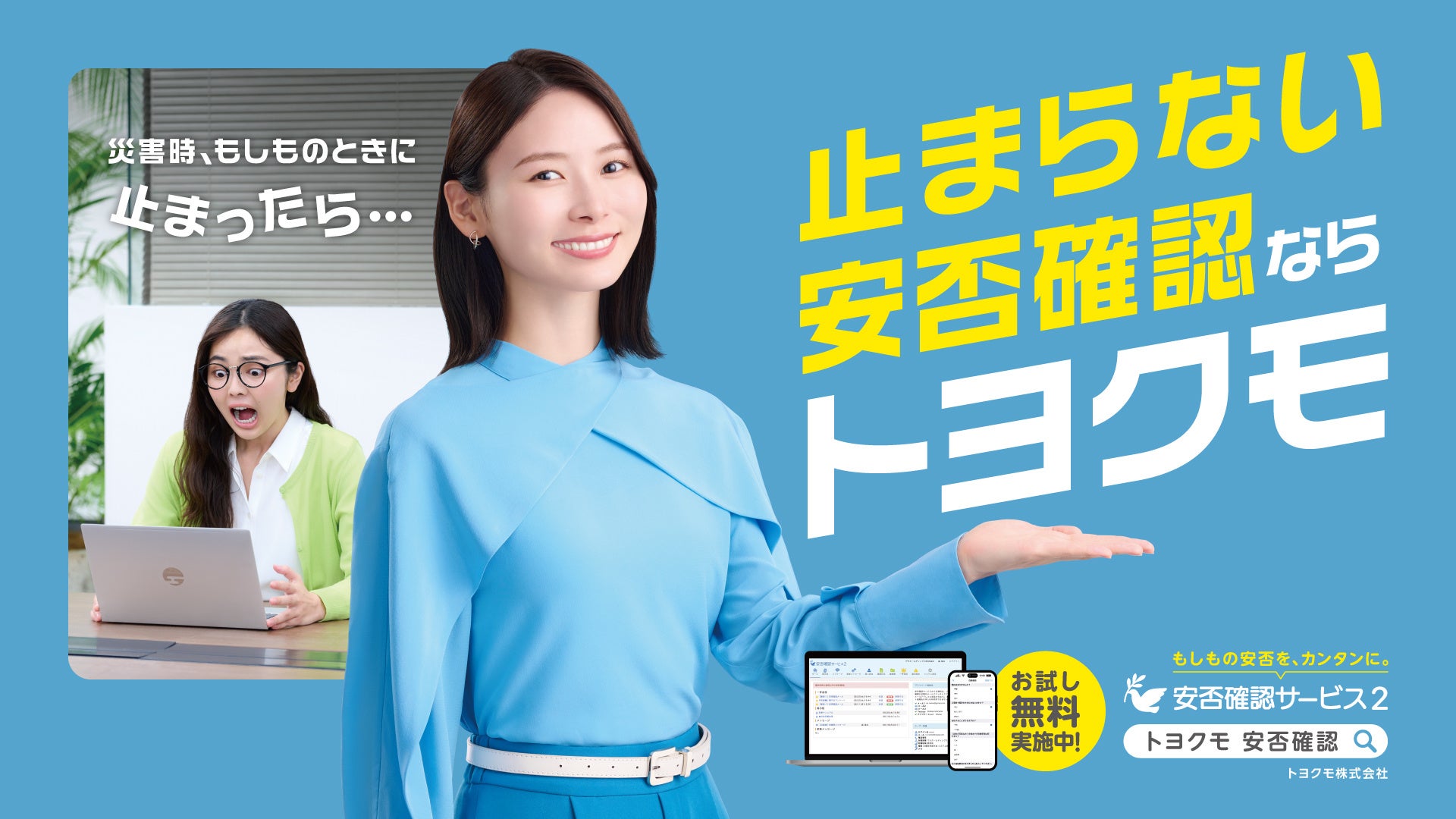 災害時の企業向け安否確認システム「安否確認サービス2」を提供するトヨクモ株式会社(本社:東京都品川区 代表取締役社長:山本 裕次 以下、「トヨクモ」)は、タレントの朝日奈央さんを起用した新CM「固まる総務部」篇を9月2日より公開いたします。