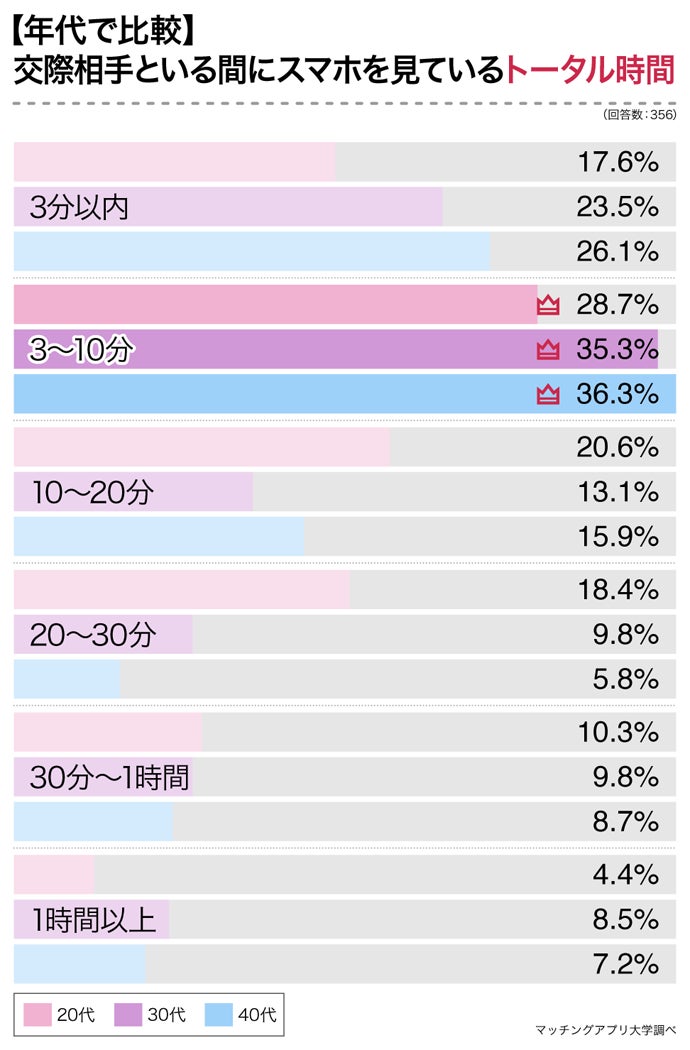 - デート中のスマホ閲覧は、5割以上の男女が10分以内