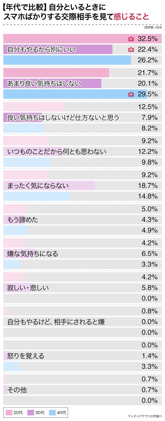 また、20代では「怒りを覚える」という回答がありませんでしたが、30・40代はわずかながら「怒りを覚える」という回答があり、デート中のスマホ閲覧に対する嫌悪感は年齢を重ねるほどに強くなる傾向が見て取れました。