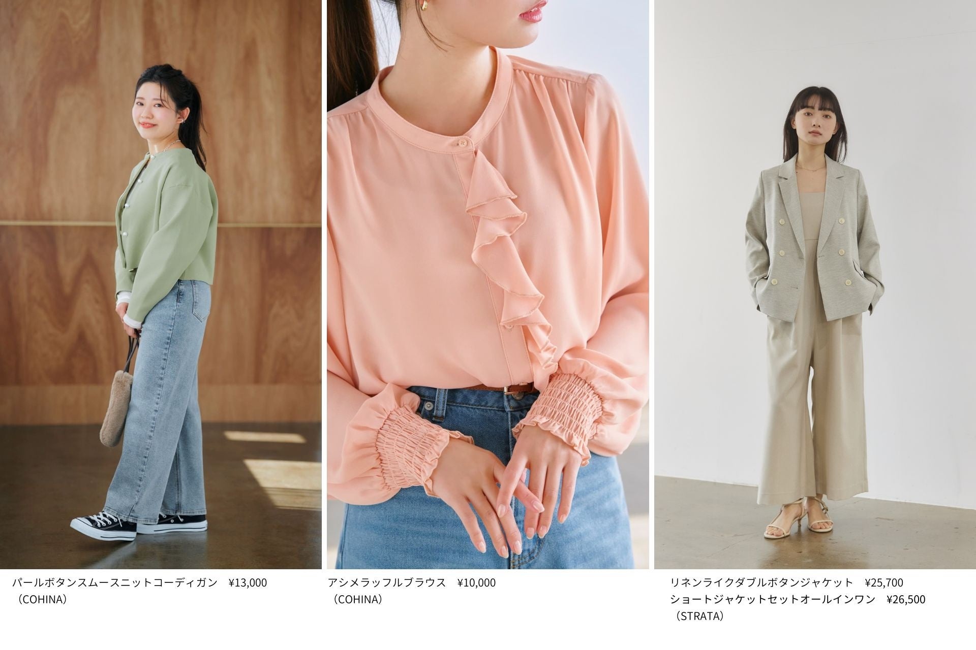 このたび開催するポップアップストアでは、COHINAだけでなく、大人な小柄女性のためのブランド「ŚTRATA(エストラータ)」の春の新作なども、多数ご用意しております。いずれも数量限定のためなくなり次第終了となりますのでご了承ください。なお、人気ライバーも店頭に立って皆さまをお待ちしております。