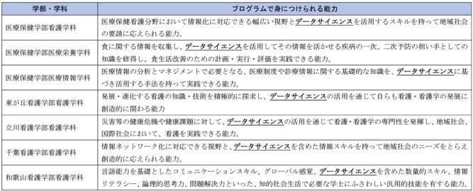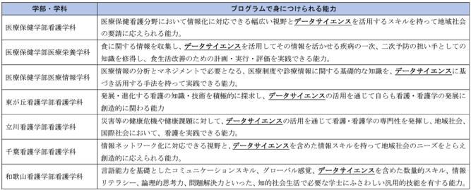 そこで本学では、5学部7学科(看護5学科、栄養1学科、情報1学科)すべての教育課程に共通する「ヘルスデータサイエンスプログラム」を構築し2021年度から適用を行っております。本プログラムは、情報リテラシー、統計リテラシーといったデータサイエンスの素養を全学部・学科共通で学ぶこととした上で、その素養を活かして看護・栄養・情報それぞれの専門分野でデータ活用を実践するものです。本制度に認定されたことによって、ヘルスデータサイエンスプログラムを通じて、数理・データサイエンスを活用して医療保健分野で課題を解決する人材を育成していくよう努めてまいります。