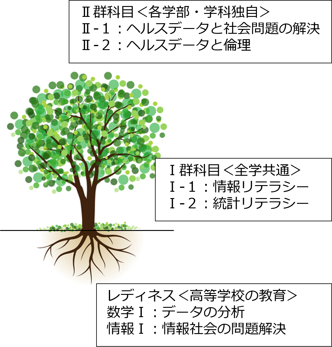 このプログラムは、高等学校でのレディネス(数学Ⅰや情報Ⅰでの学び)を「果樹の根」、本学でのⅠ群科目を「果樹の幹」、同じくⅡ群科目を「果樹の実」というイメージで構成されています。