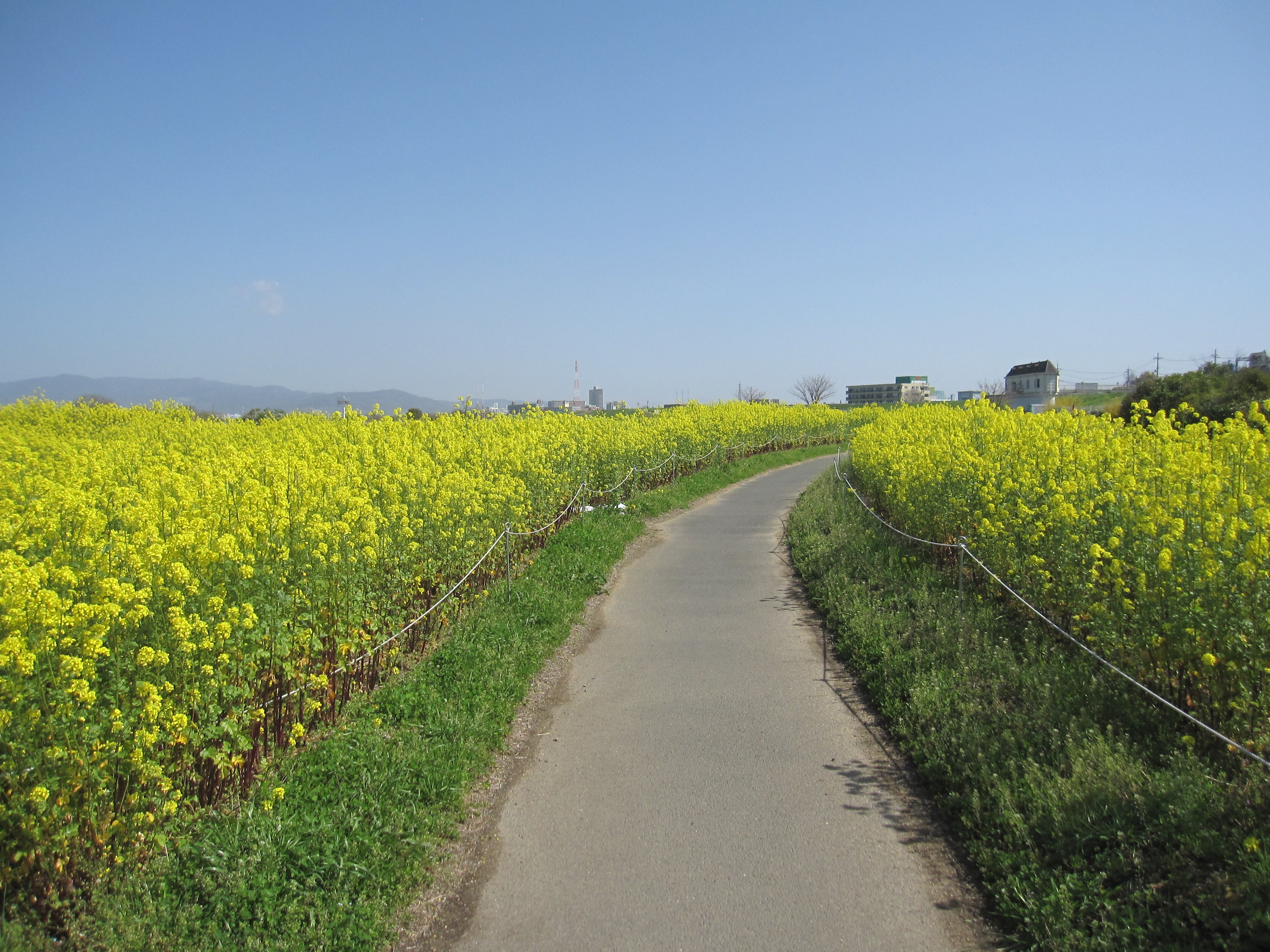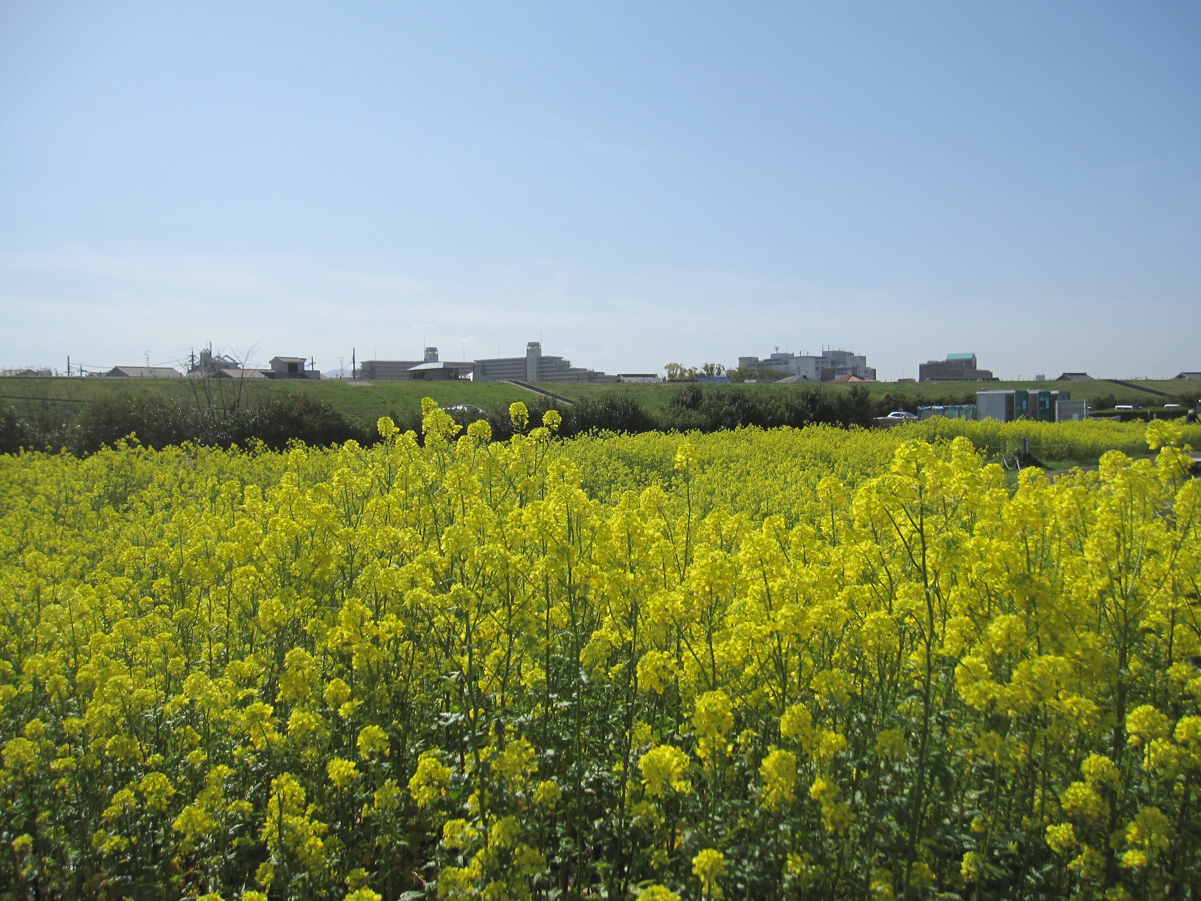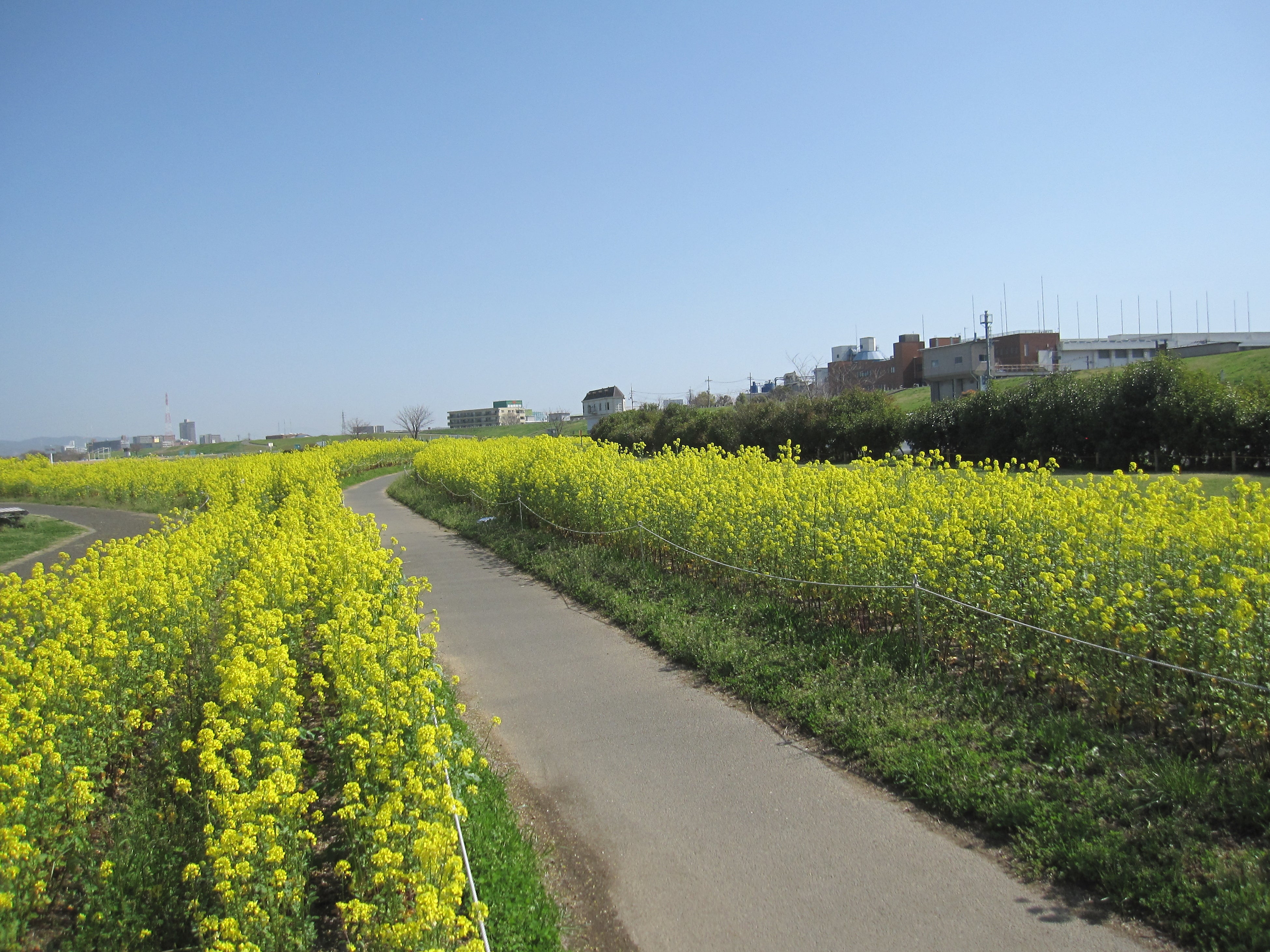 ■見どころ:3月下旬から長期間にわたってお楽しみいただけます。草丈1m以上のナノハナが園路沿いに咲き誇り一面のナノハナロードが来園者をお出迎えいたします。咲き終わったナノハナで、とりかい高等支援学校と協働でたい肥つくりを行っております。