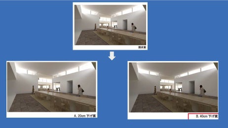 「みんなの工場」では、冒頭の入江さんの振り返りにもあったように、「自然光が差し込む明るい工場でいきいきと働く人たちに更に光を当てたい」ということが建築家として大きなコンセプトになっています。通常、大きな建物では窓から遠いほど自然光が届かず暗くなってしまいますが、内部まで自然光を取り入れ明るくするために、ハイサイドライト(高窓)を大きく設計に取り入れていました。しかし、ハイサイドライトは、20cmの高さで数百万円にもなる、大きくコストに直結する設備。今井と福永は、1年の半分以上雪が降り曇天が続く中、高窓の高さがどれくらい影響するだろうか?と、疑問を投げかけ、10cm刻みで何パターンもの検証が行われました。最終的には当初より40cm下げる案に着地しましたが、それもイメージ画像から決めた結果。事前にできる検討は尽くしたが、実際はどのような明るさで、訪れる皆さんはどう感じるかまだわからないと、登壇者たちは笑い合いながら、ぜひ体感してみてほしいと視聴者にも呼びかけます。まさに、ありのままを伝え、みんなで作っていく施設であることを感じられる座談会の一コマでした。
