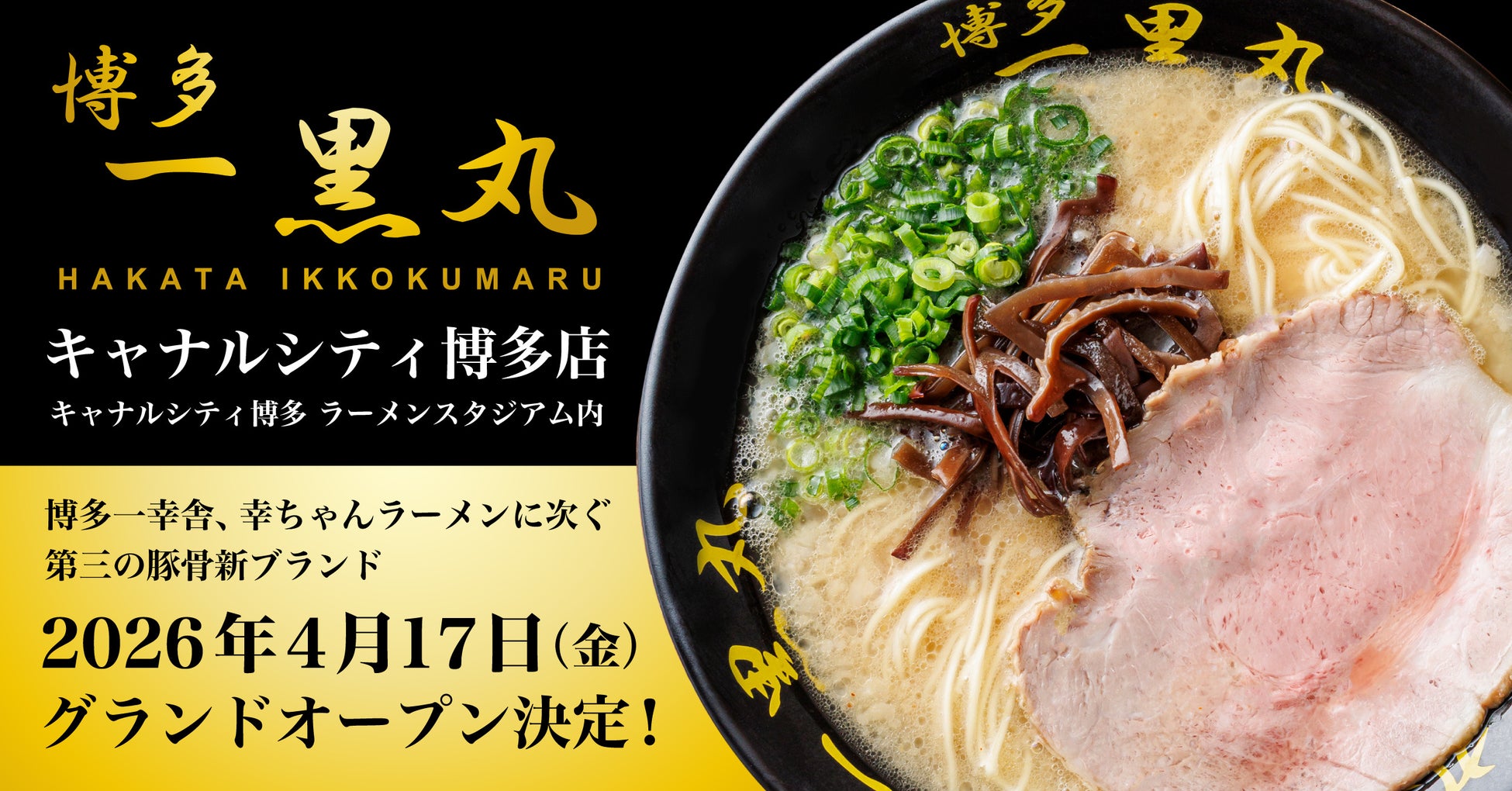 世界10カ国90店舗以上を展開、ラーメンのグローバルブランド博多⼀幸舎や幸ちゃんラーメンを運営する、株式会社ウインズジャパンホールディングス(所在地 福岡県福岡市博多区、代表取締役社⻑ 吉村 幸助 以下当社)は、2026年4月17日(金) 11:00に「博多一黒丸 キャナルシティ博多店」をキャナルシティ博多センターウォーク5Fラーメンスタジアム内にグランドオープンすることが決定いたしました。皆様お誘いあわせの上、この幻のラーメンの復活をぜひご体験ください。