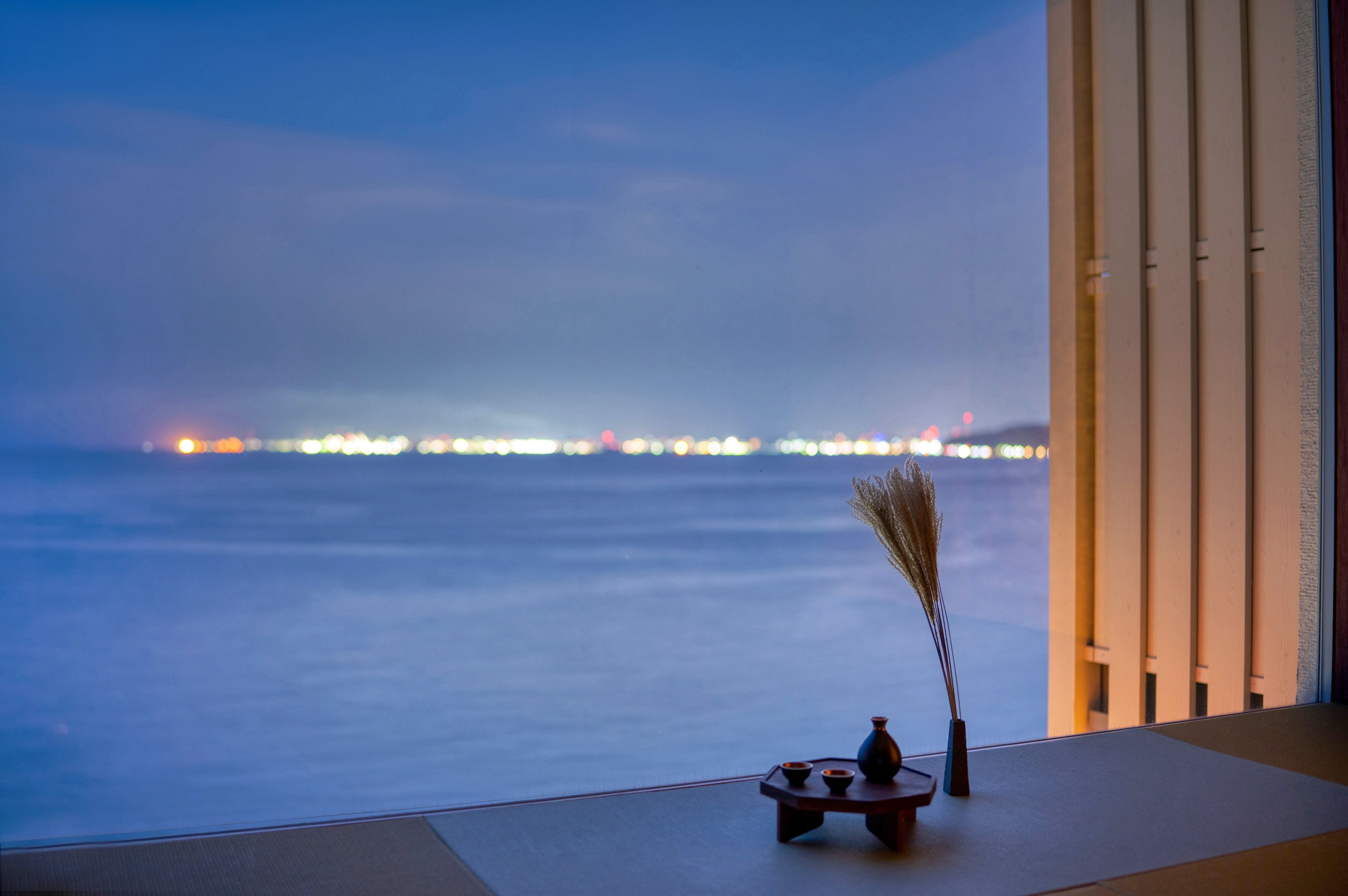界 別府の特別室は最上階の11階にあり、窓の幅が広く、床から天井までがガラス張りのため特に景色がよく見えます。風と波が穏やかな快晴の日には、月の出から1時間程の間にムーンロードが現れることがあります。窓の近くで寛ぎながら月の移ろいを見ることができ、また、特別室には露天風呂が備え付けられているため、月見温泉として入浴しながら月を望むこともできます。別府湾に映し出されるムーンロードや秋の名月をプライベートな空間で楽しみながら過ごします。