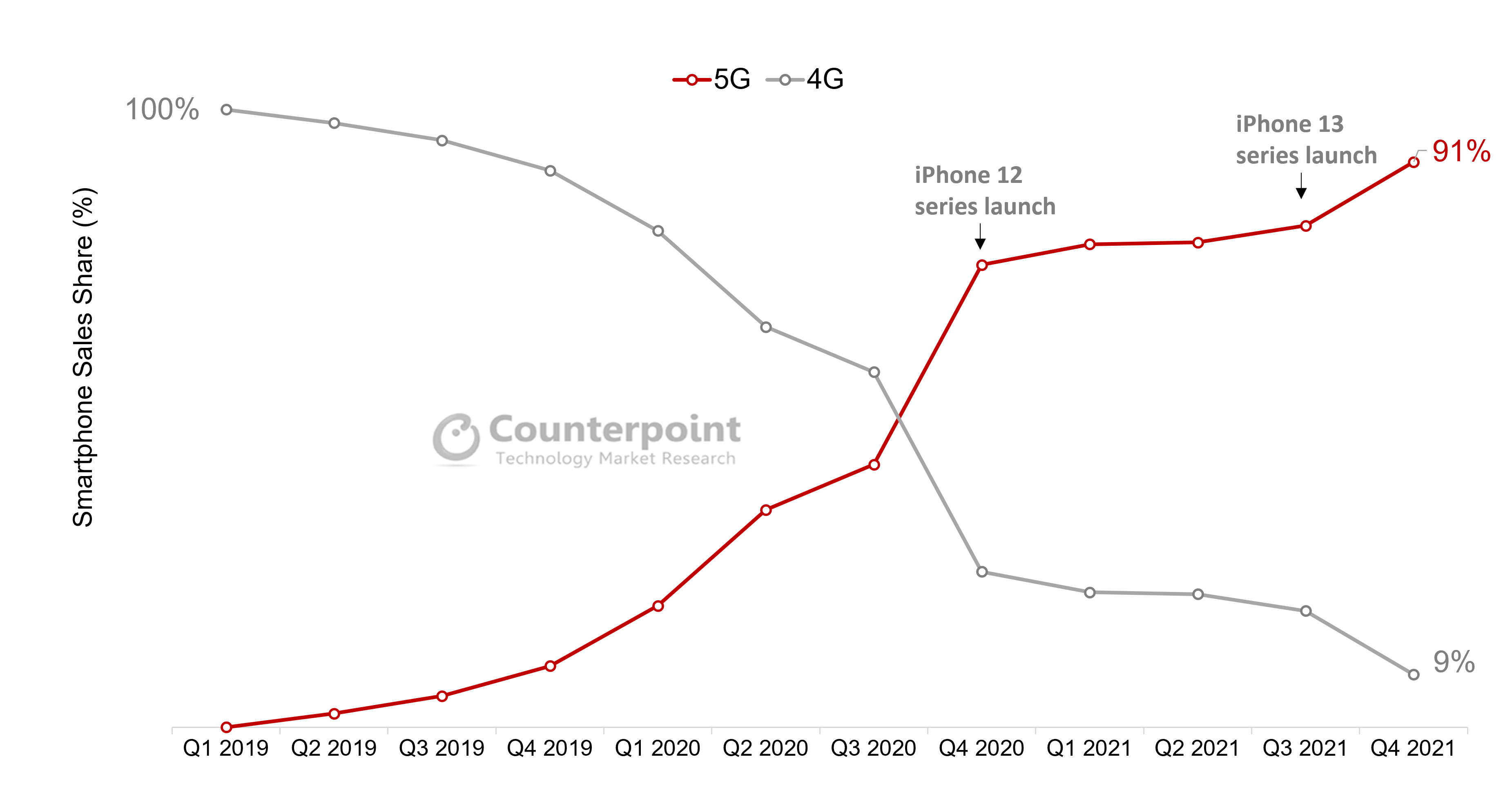 プレミアム機種(400米ドル以上)における5Gと4Gの搭載比率