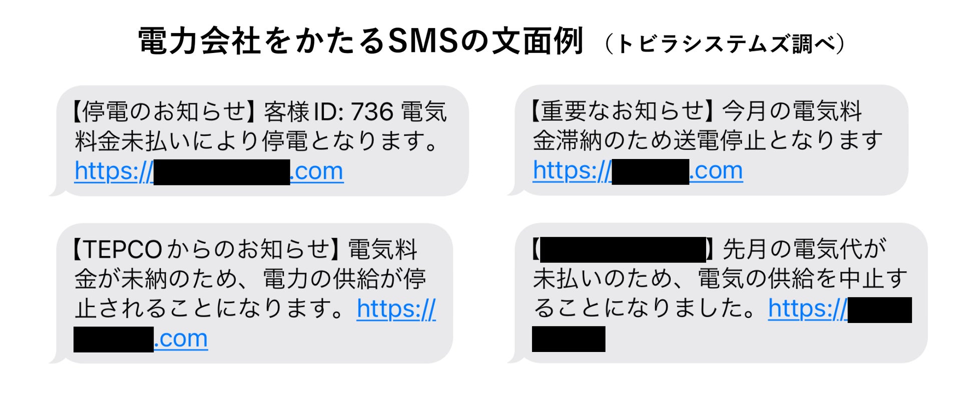 電力会社をかたるSMSによる「フィッシング詐欺」が多発しています。「未納料金がある」「送電を停止する」などと記載されたSMSから、電力会社のウェブサイトを装った偽サイトに誘導し、個人情報やクレジットカード情報を盗み取る手口が確認されています。