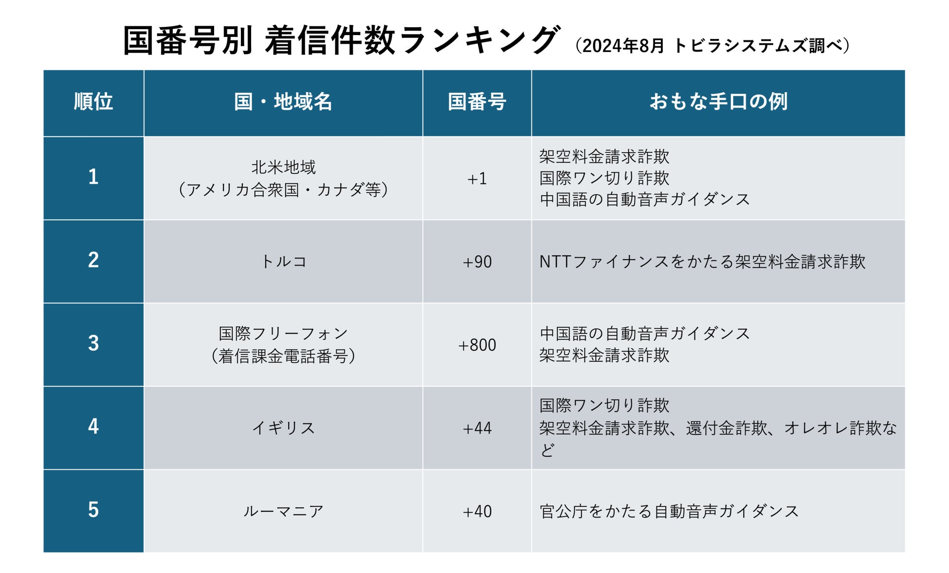 当社の調査で、2024年8月に着信件数が多かった国際電話の国番号は、上位からアメリカ合衆国やカナダなどの北米地域、トルコ、国際フリーフォン、イギリス、ルーマニアでした。