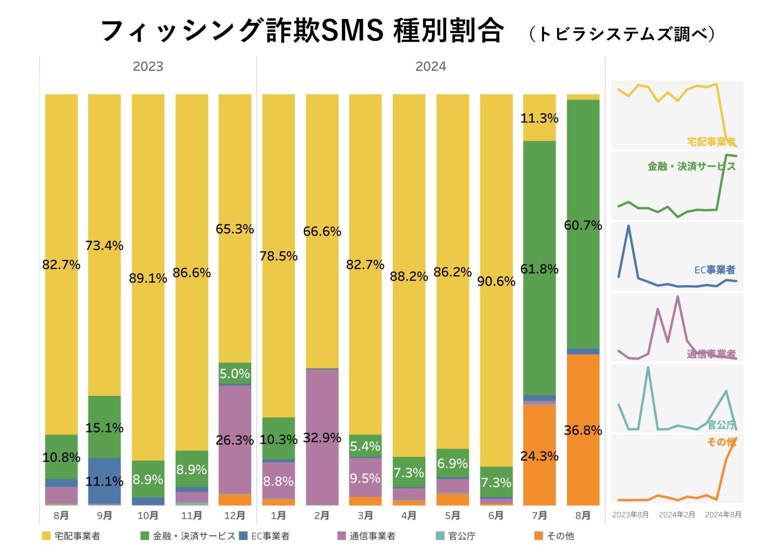 トビラシステムズの調査で、2024年8月に確認されたフィッシング詐欺のSMSの種別割合は、金融・決済サービスをかたる手口が最も多く60.7%となりました。その他の事業者をかたる手口の割合は前月から増加し36.8%で、主に電力会社をかたるSMSの多発が続いています。なお、宅配事業者をかたる手口の割合は前月に続き減少し、1.2%となりました。