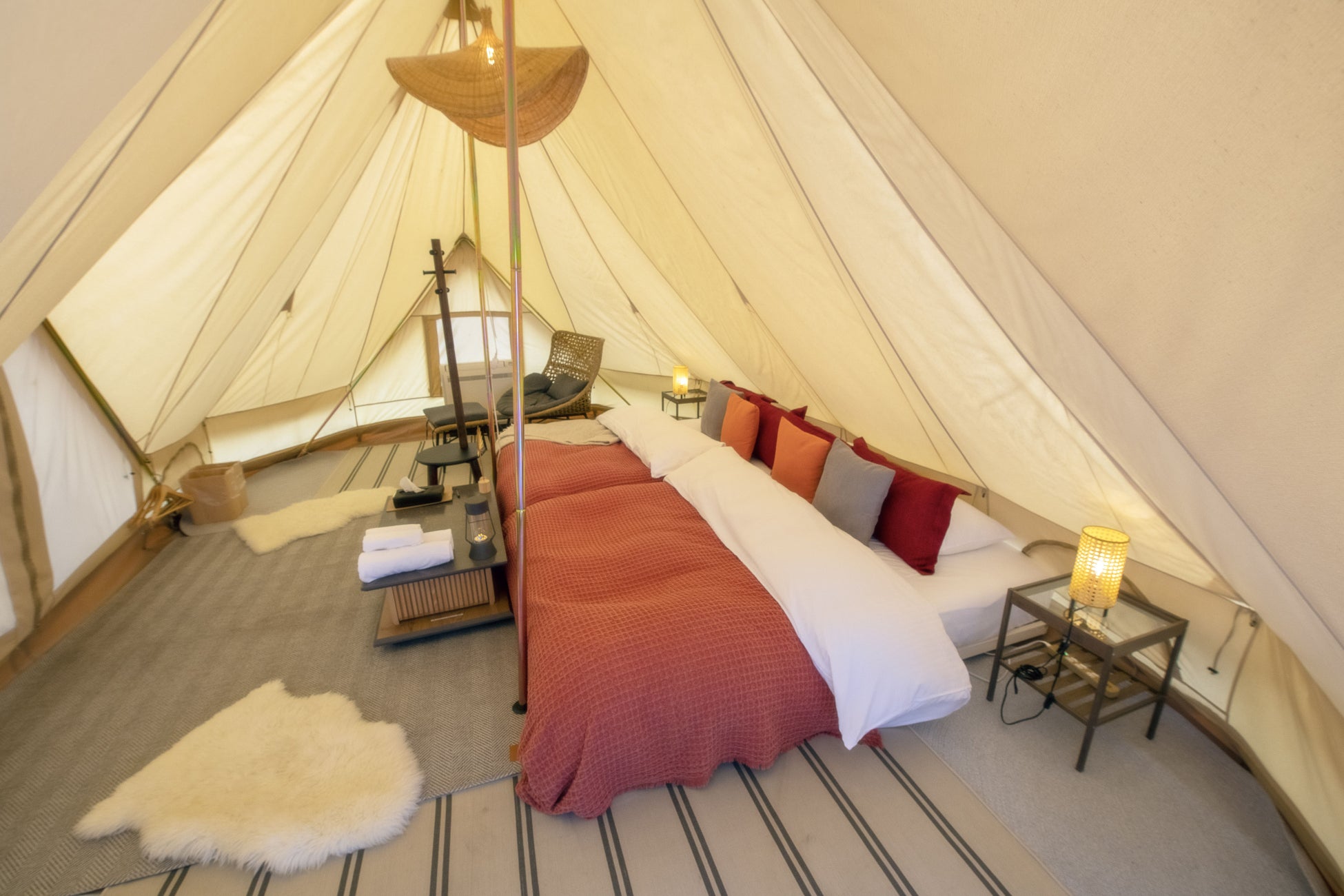 皇帝テントは、快適なアウトドア体験を提供するために設計された特別なお部屋。 広々とした空間は、くつろぎやすく、かつ通常のキャンプやアウトドア体験とは異なるスペシャルな宿泊体験をご提供します。贅沢な環境で自然と調和し、非日常の休暇をお楽しみいただけます。
