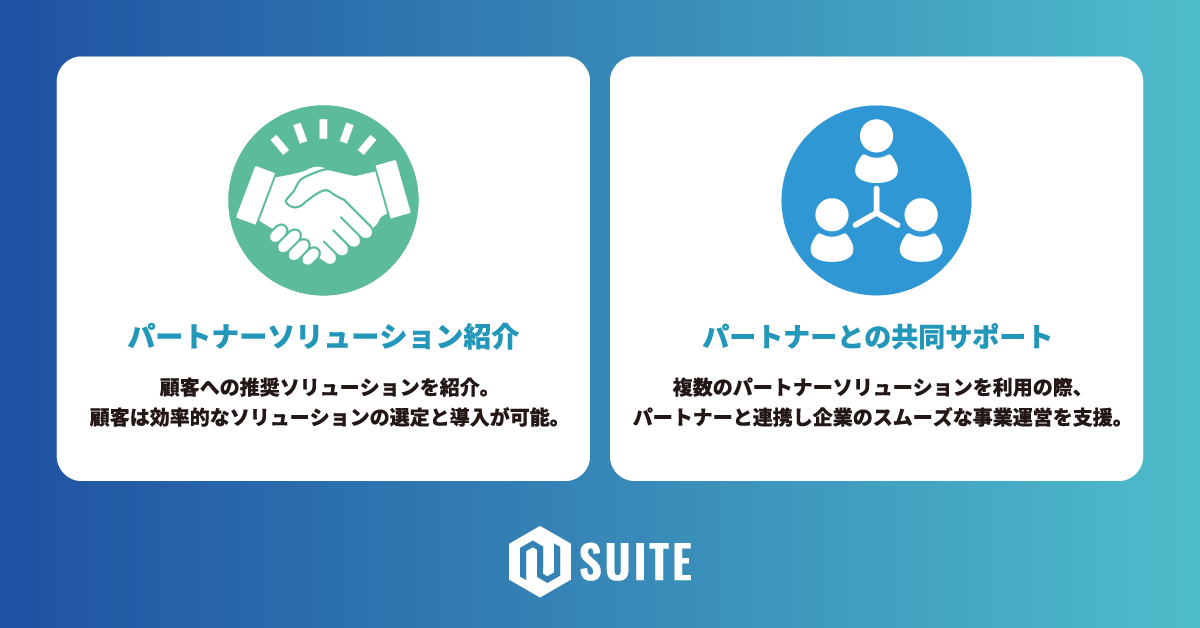 パートナーは活動の実績に応じて、紹介手数料や販売差益を得ることができます。パートナーによるN Suiteを紹介・サポートに対して報酬を提供することで、パートナーとの連携したソリューション提供を推進します。