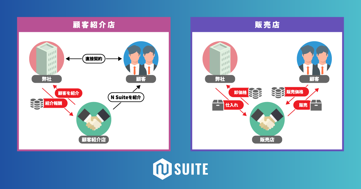 パートナーが企業にN Suiteを紹介する「顧客紹介店」と、パートナーがN Suiteの紹介・契約締結・サポートまで一気通貫して行う「販売店」の2種類のモデルがあります。
