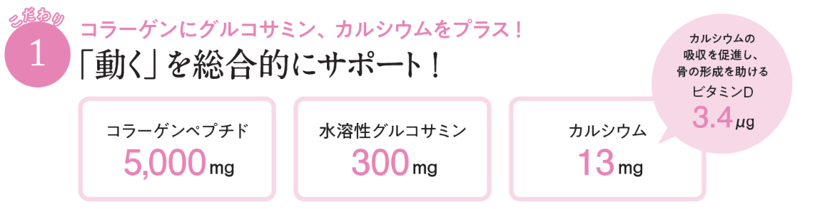 コラーゲンにグルコサミン、カルシウムをプラスして、「動く」を総合的にサポートします。コラーゲンペプチド5,000mg、水溶性グルコサミン300mg、カルシウム13mg等を配合。カルシウムの吸収を促進し、骨の形成を助けるビタミンD3.4μg、欲しいに応える栄養素をお届けします。