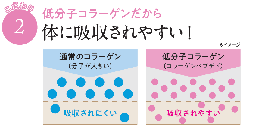 低分子コラーゲン(コラーゲンペプチド)を配合、体に吸収されやすく質の良いコラーゲンを摂取することで、いきいきとハリのある毎日をサポートします。