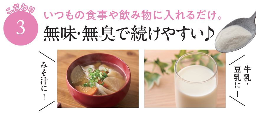 生活スタイルを問わず、日常使いで無理なく続けられるよう、無味・無臭にこだわりました。いつもの食事や飲み物に入れるだけでとっても簡単に飲み続けることができます。