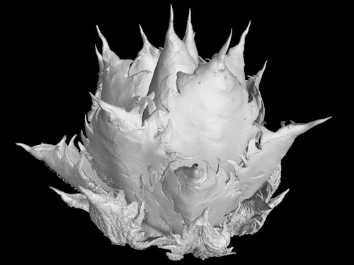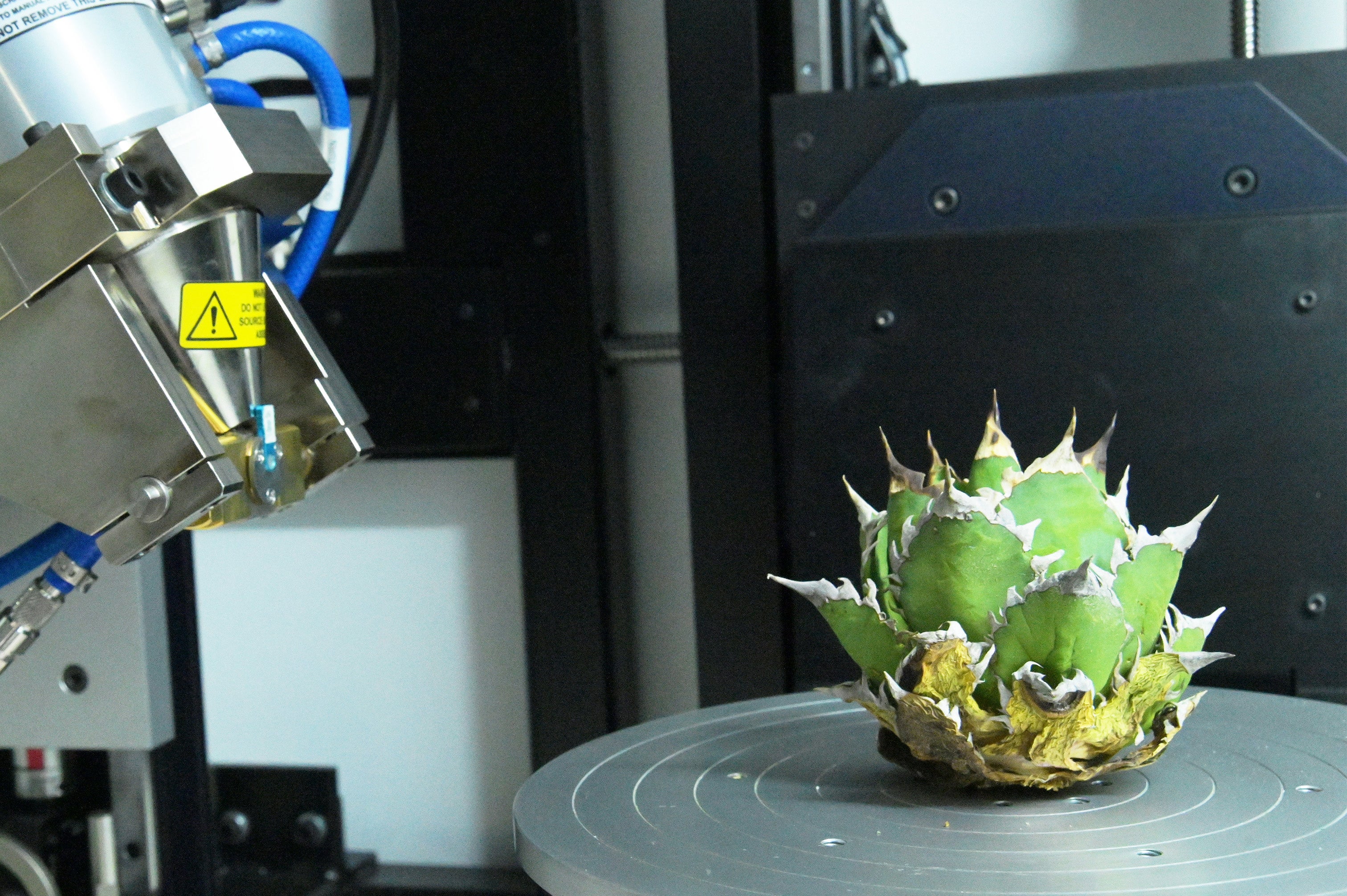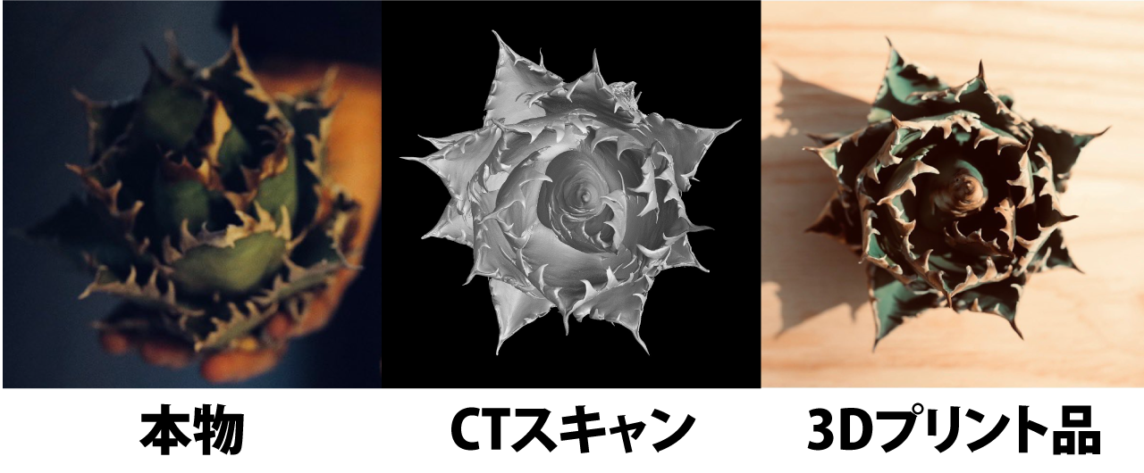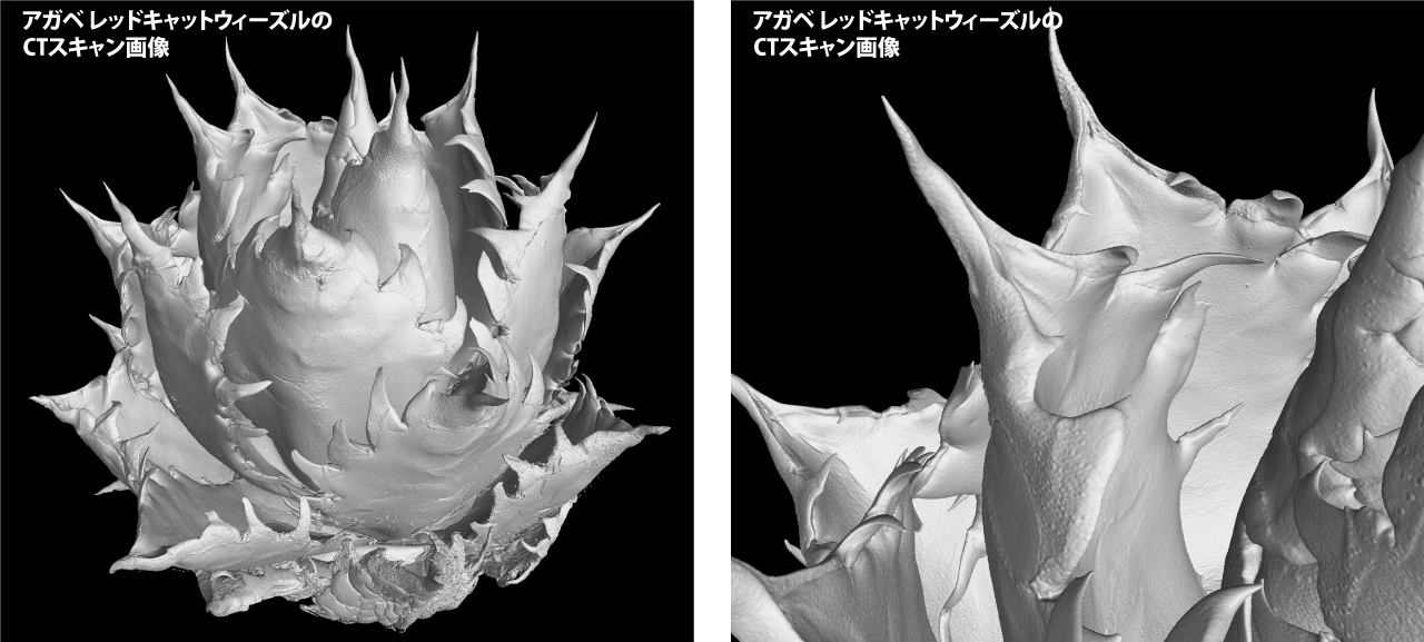 アガベ チタノタ "レッドキャットウィーズル"は美しい形に育てるのが非常に難しくまた数日で形が変化してしまう為、一番美しい状態のままフィギュアにしたいとLOBINDONの橋上様からご依頼を受けて細部の形状まで高精度にスキャニングすることが可能で歴史的文化財の複製などにも使われている産業用 CT スキャンを用いてアガベ チタノタ "レッドキャットウィーズル"を撮影しその画像データを 3 次元に変換することで、モデルを作成しました。