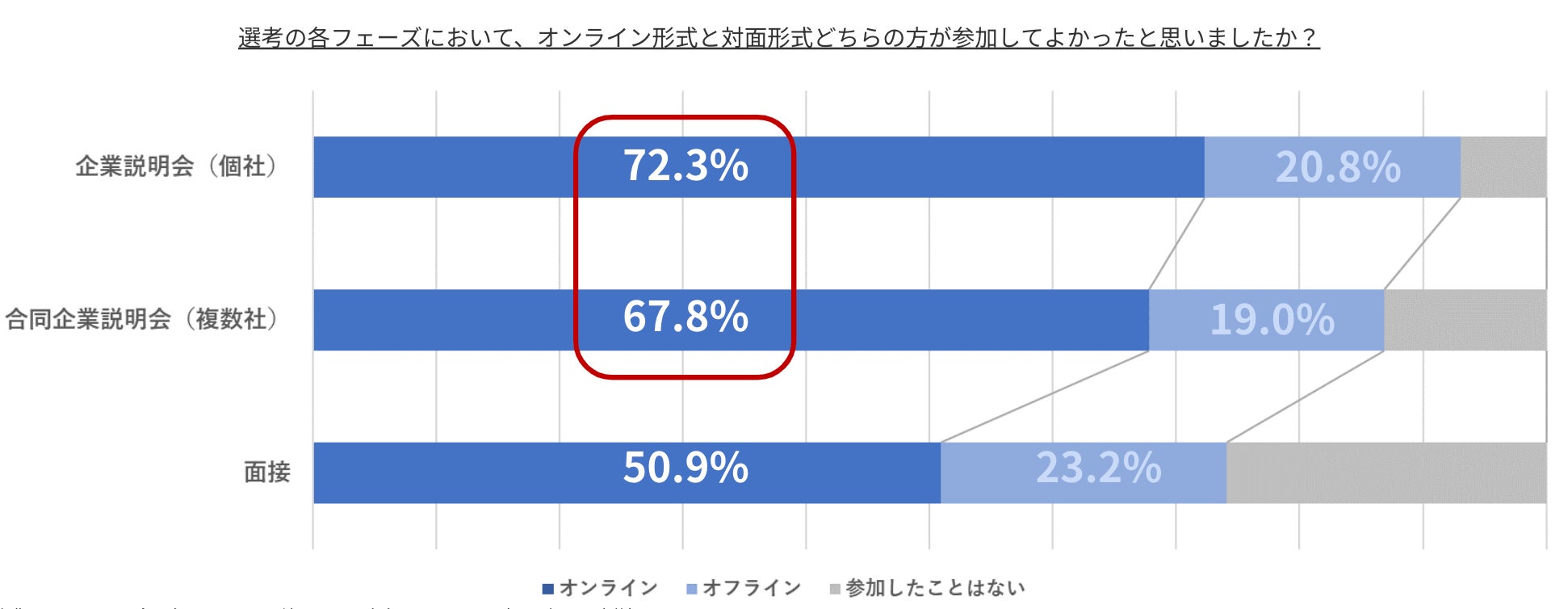 「選考の各フェーズにおいて、オンライン形式と対面形式ではどちらの方が参加してよかったと思いましたか?」という質問に対しては、企業説明会・合同企業説明会・面接全てにおいて「オンライン」を希望する声が最も多い結果となりました。