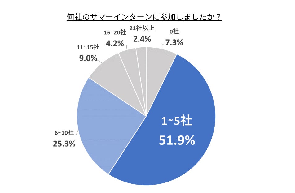 1.約半数の学生が1~5社の企業インターンシップに参加。2024年卒と比較し、参加社数は減少。