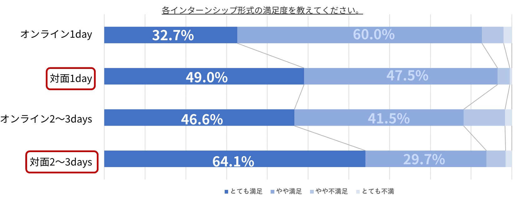 ・インターンシップの実施形式は「対面×複数日開催」が最も満足度が高い結果に