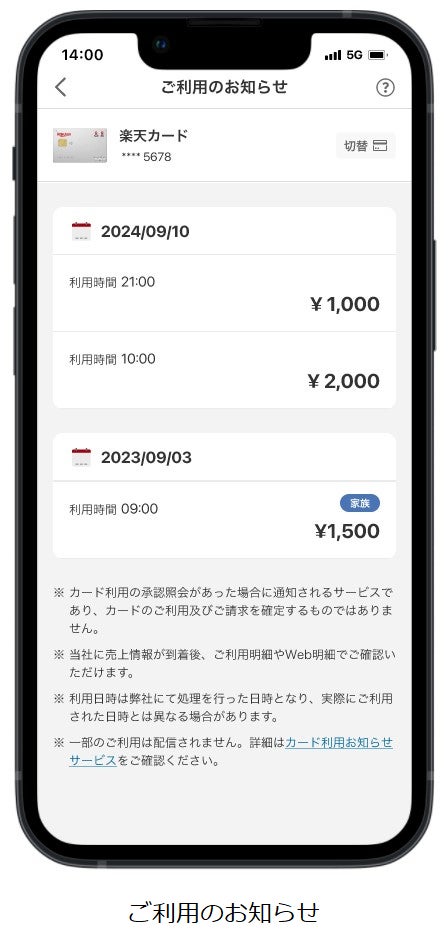 本サービスは「楽天カードアプリ」の設定画面から登録していただくことで、カード利用内容をプッシュ通知にてリアルタイムに受け取ることができます(注2)。また、受け取った通知は「ご利用のお知らせ」から、過去1週間分をいつでも確認することができます。