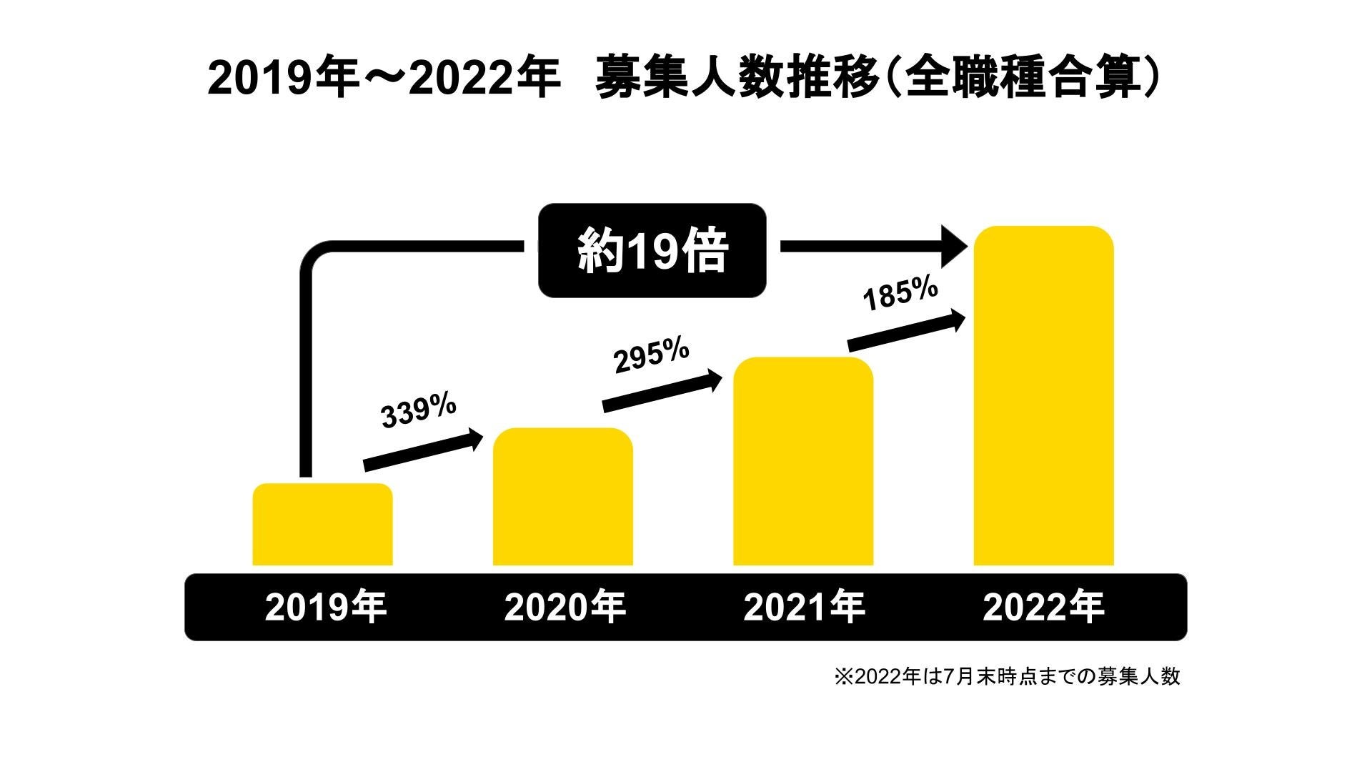 事業者数・事業所数の拡大にともない、募集人数も急拡大しています。2019年と2022年を比較するとタイミー上の募集人数は約19倍になっています。(2022年7月末時点の募集人数)