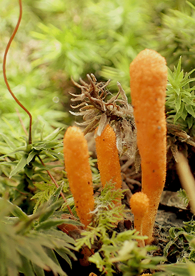 冬虫夏草は虫草菌の一種で、生きた昆虫に虫草菌が寄生して体内に菌糸の核をつくり、季節が来ると昆虫の頭部や関節から子実体(菌類が胞子形成のために作る複合的な構造)を伸ばして生育したものである。
