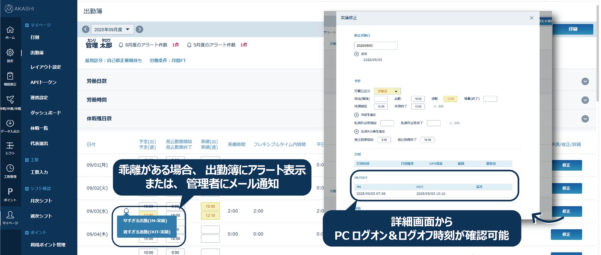 これにより、「AKASHI」で従業員が打刻した出勤・退勤時間と「ez-PCLogger」から自動連携されたPCのログオン&ログオフ時間との乖離が自動的に判定されることでサービス残業の検知等、従業員の勤務実態のより正確な把握が可能となります。