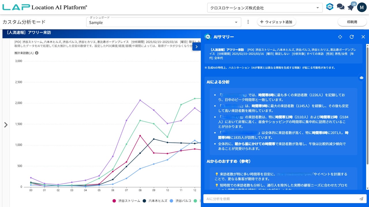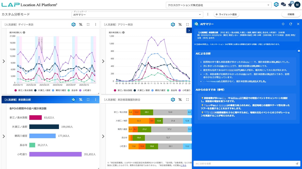 クロスロケーションズ株式会社(本社:東京都渋谷区、代表取締役:小尾 一介、以下「クロスロケーションズ」)は、自社開発の人流データ分析プラットフォーム「Location AI Platform®(以下、LAP)」および「人流アナリティクス®」に、新たに生成AI技術を統合し、その第一段階として、新機能「AI サマリー」の提供を本日より開始します。(注)「人流アナリティクス®」のフリーアカウントでも利用可能。