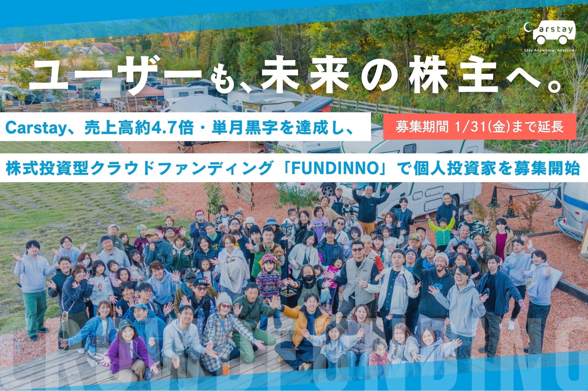 キャンピングカーと車中泊スポットのシェアリング・サービス、車両製造、改装支援など国内最大級のバンライフのプラットフォーム事業を展開するCarstay(カーステイ)株式会社(本社:神奈川県横浜市、代表取締役:宮下晃樹(みやした こうき))は株式会社FUNDINNO(ファンディーノ)の株式投資型クラウドファンディングサービスの「FUNDINNO」を介した個人投資家やCarstayのサービス利用者を将来の株主に迎え入れる「コミュニティラウンド」による資金調達の募集期間を1月31日(金)23:59まで延長したことをお知らせします。