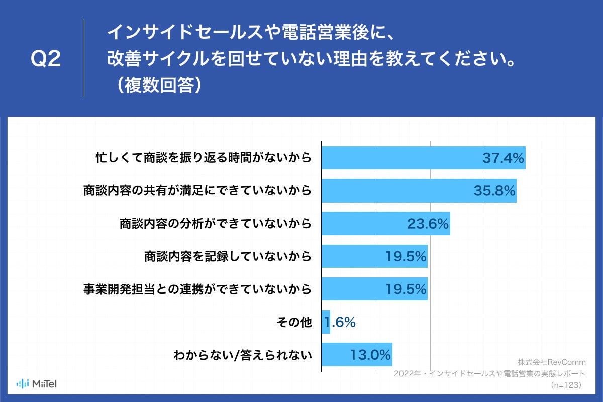 Q1で「あまりできていない」「全くできていない」と回答した方に、「Q2.インサイドセールスや電話営業後に、改善サイクルを回せていない理由を教えてください。(複数回答)」(n=123)と質問したところ、「忙しくて商談を振り返る時間がないから」が37.4%、「商談内容の共有が満足にできていないから」が35.8%、「商談内容の分析ができていないから」が23.6%という回答となりました。