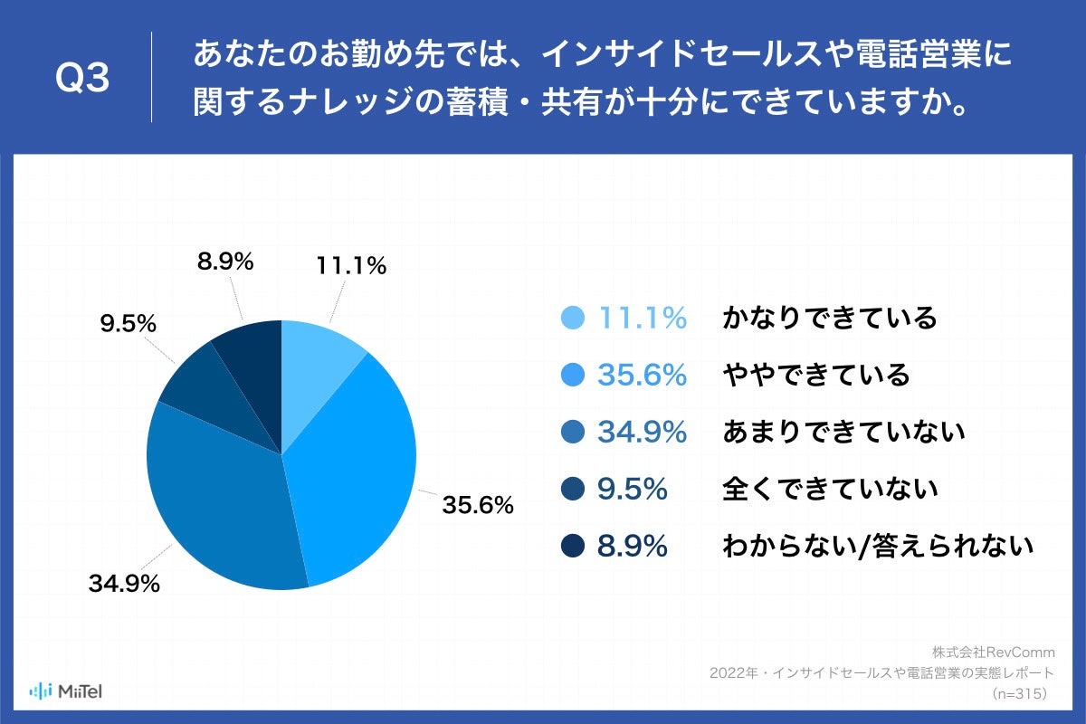 「Q3.あなたのお勤め先では、インサイドセールスや電話営業に関するナレッジの蓄積・共有が十分にできていますか。」(n=315)と質問したところ、「あまりできていない」が34.9%、「全くできていない」が9.5%という回答となりました。