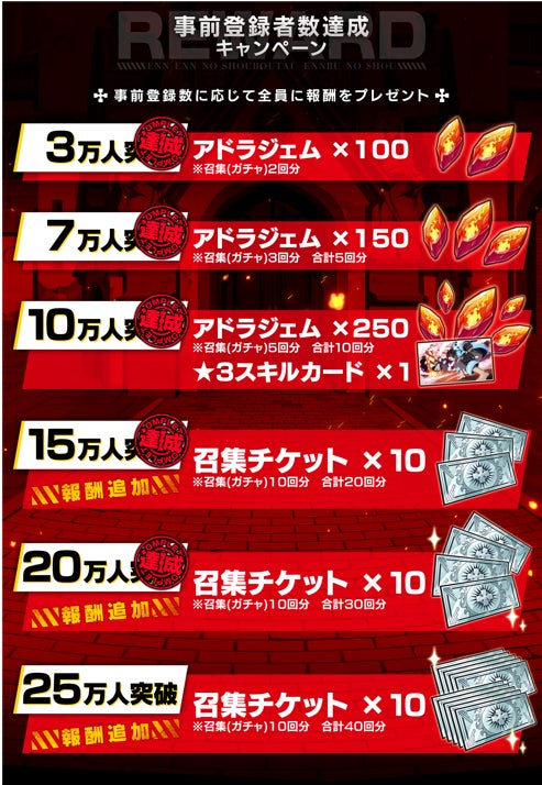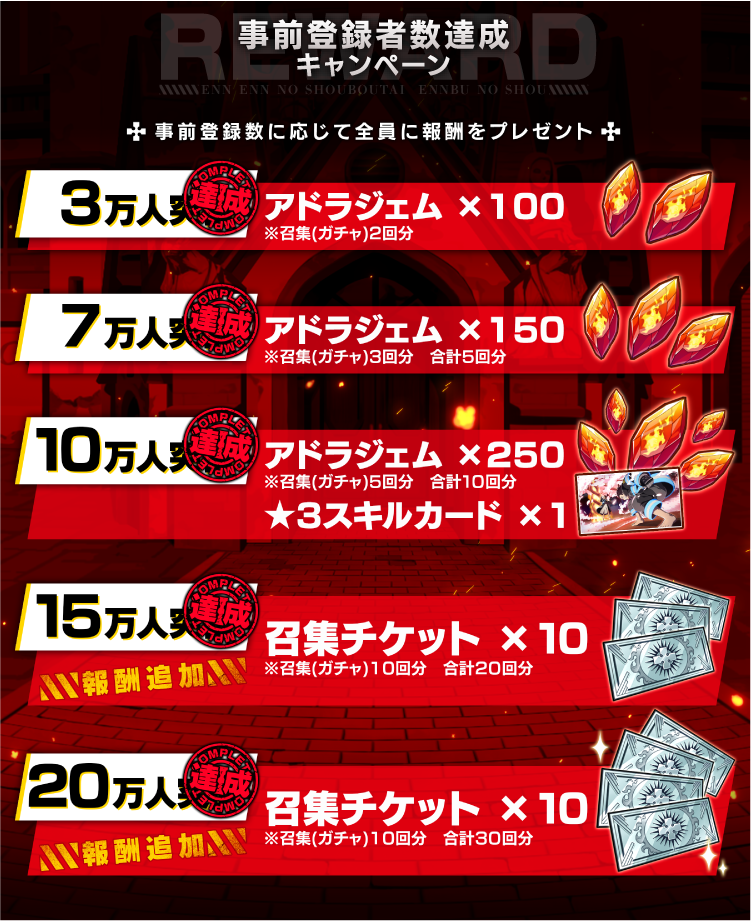 - 事前登録特典:25万人突破における報酬を追加!