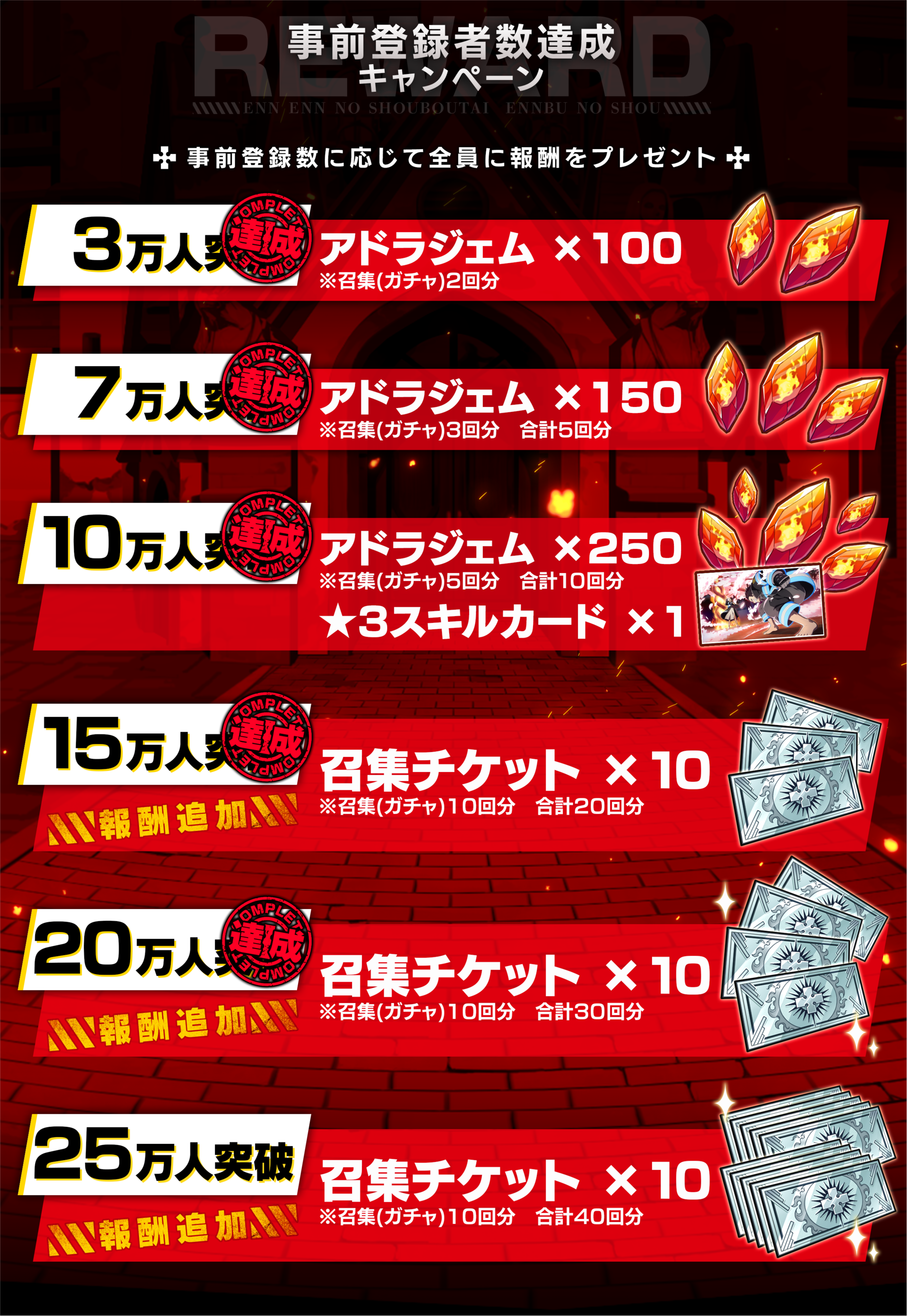・10万人 アドラジェム×250 ★3スキルカード×1 ※召集(ガチャ)5回分 合計10回分達成!