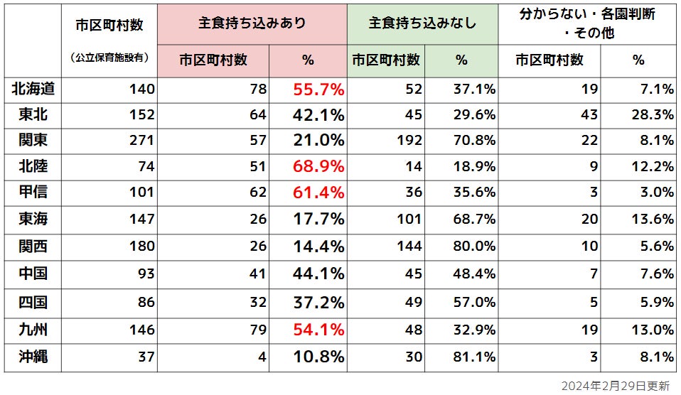 ①北海道・北陸・甲信・九州エリアでは半数以上が主食を持参させているという結果に。