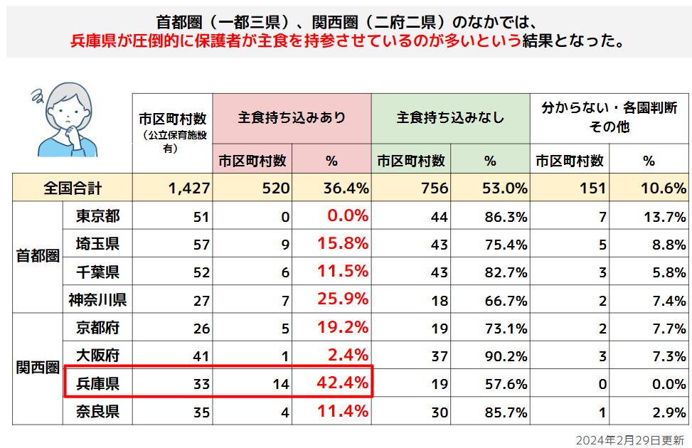さらに首都圏(一都三県)、関西圏(二府二県)に絞って主食持参の割合をみると、兵庫県が圧倒的に高い結果となっています。
