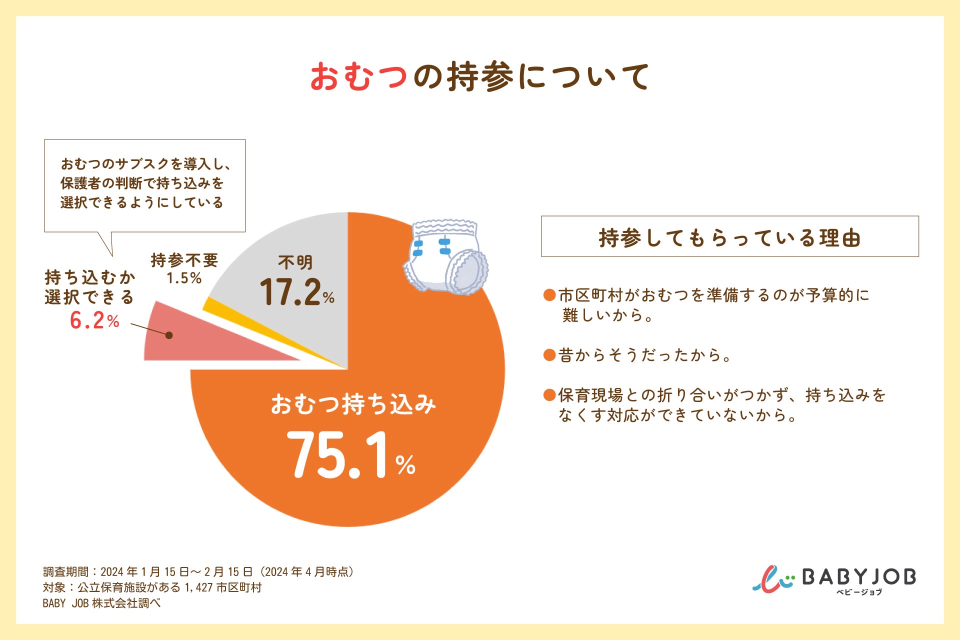 BABY JOB株式会社(本社:大阪府大阪市、代表取締役社長 上野公嗣)が運営する「保育園からおむつの持ち帰りをなくす会」は、公立保育施設がある全国1,427の市区町村の保育課に対し、公立保育施設における登園時の荷物について電話調査を実施しました。