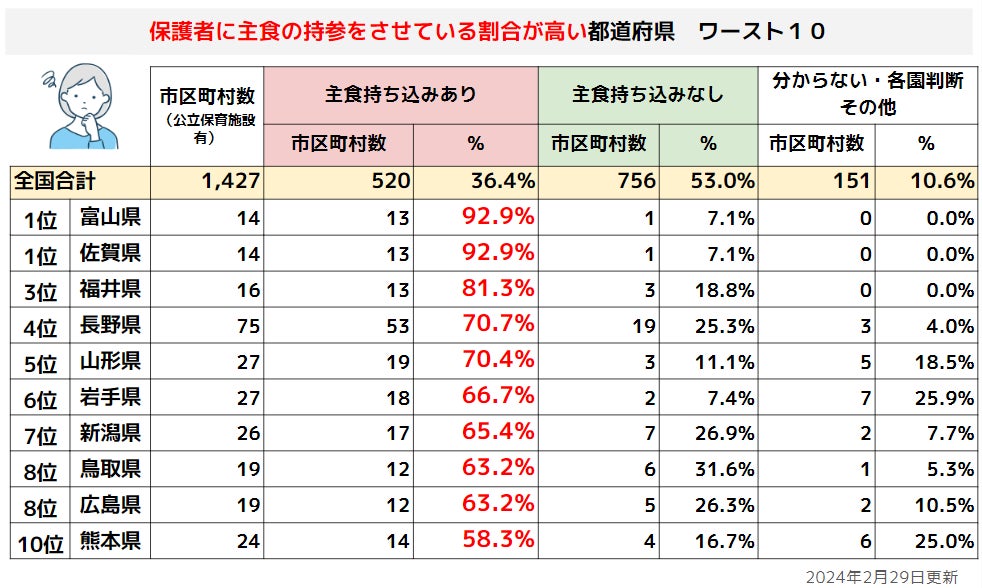 都道府県別の調査結果をみると、富山県と佐賀県では主食の持参率が9割を超える結果となりました。一方、和歌山県では27市町村全てで主食の持参がなく、代わりに保育施設で提供が行われていることがわかりました。