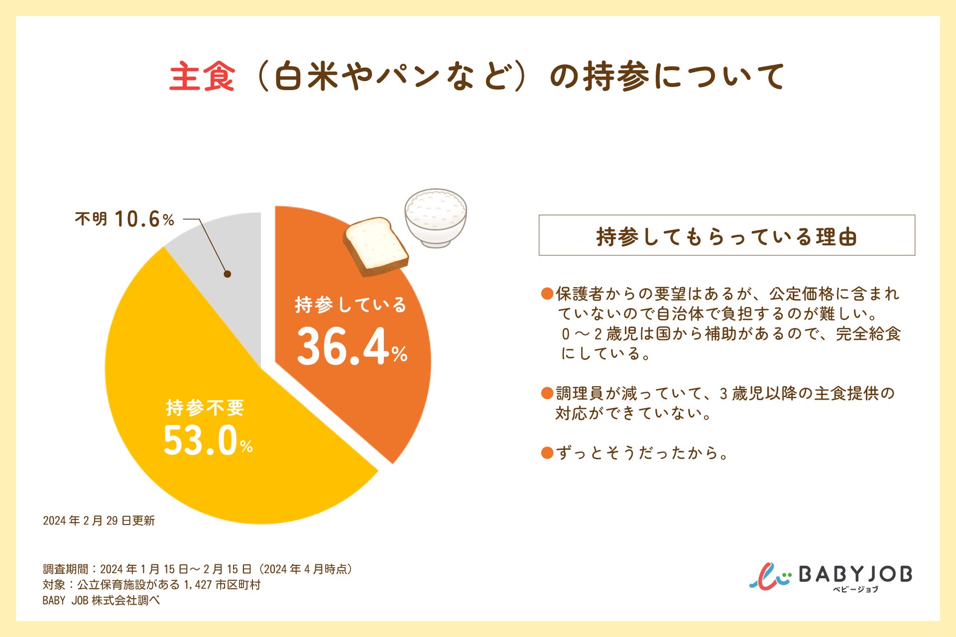 公立保育施設がある全1,427市区町村でみると、520市町村(36.4%)が主食の持参をさせていることが明らかになりました。主食の持参をさせている市町村の理由としては、「0~2歳児は国から主食費の補助が出ているが、3歳児以降は補助がないから」「提供の設備や人員が揃っていないから」「昔から持参してもらっていたから」などがありました。