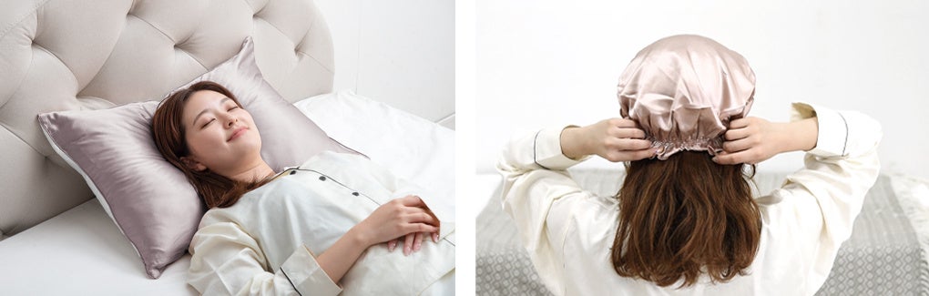 高品質の天然シルク100%生地が肌や髪の乾燥と摩擦によるダメージを軽減。保湿効果抜群のヒアルロン酸配合でツヤ髪&うる肌をキープ!