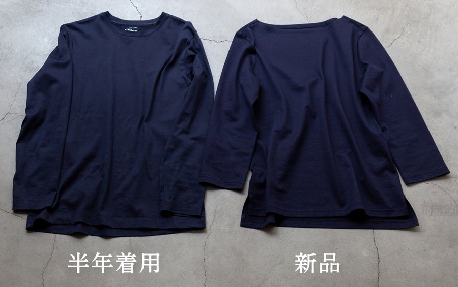 半年着用し洗濯を繰り返したTシャツと新品を比較してみても、型崩れや毛羽立ちも目立ちません。