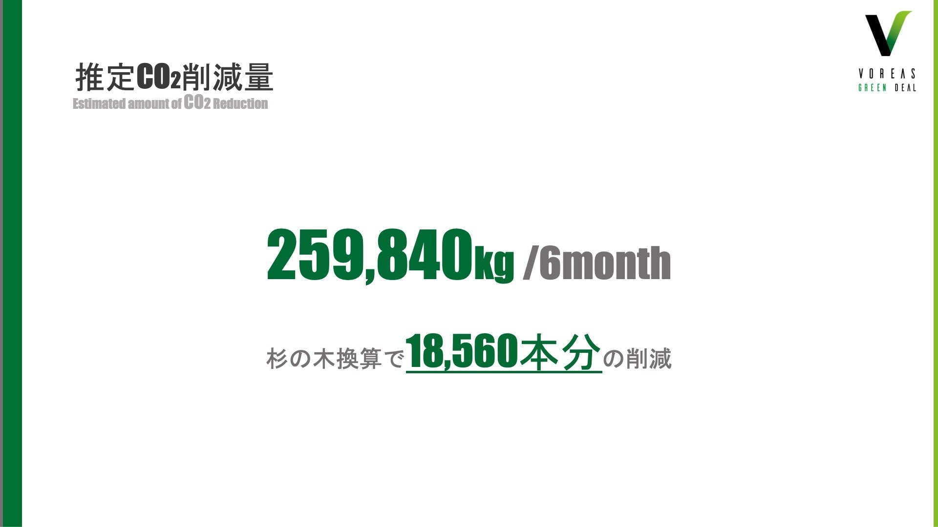 導入によるCO2削減量は推定で259tとなりました。この量は、杉の木が1年間に吸収する二酸化炭素量で換算すると18.560本です。