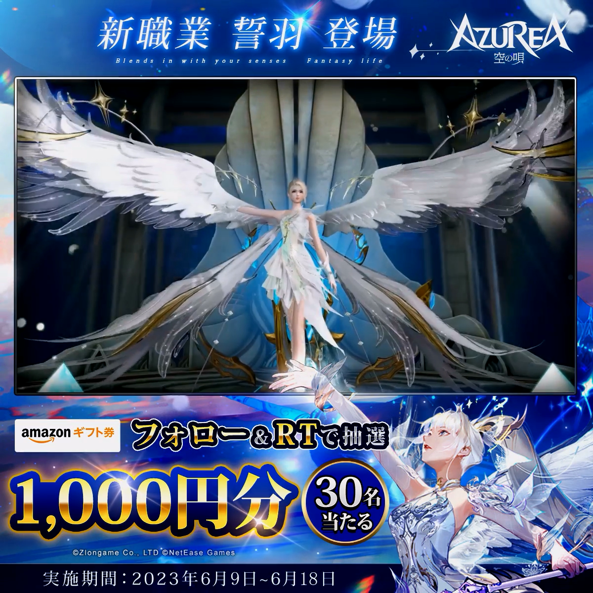 『AZUREA-空の唄-』では、今回の新職業アップデートを記念して、6月9日(金)から6月18日(日)にかけて、公式Twitterにて抽選で30名様にAmazonギフト券が当たるキャンペーンを開催いたします。詳細は、公式Twitter情報をご参照ください。