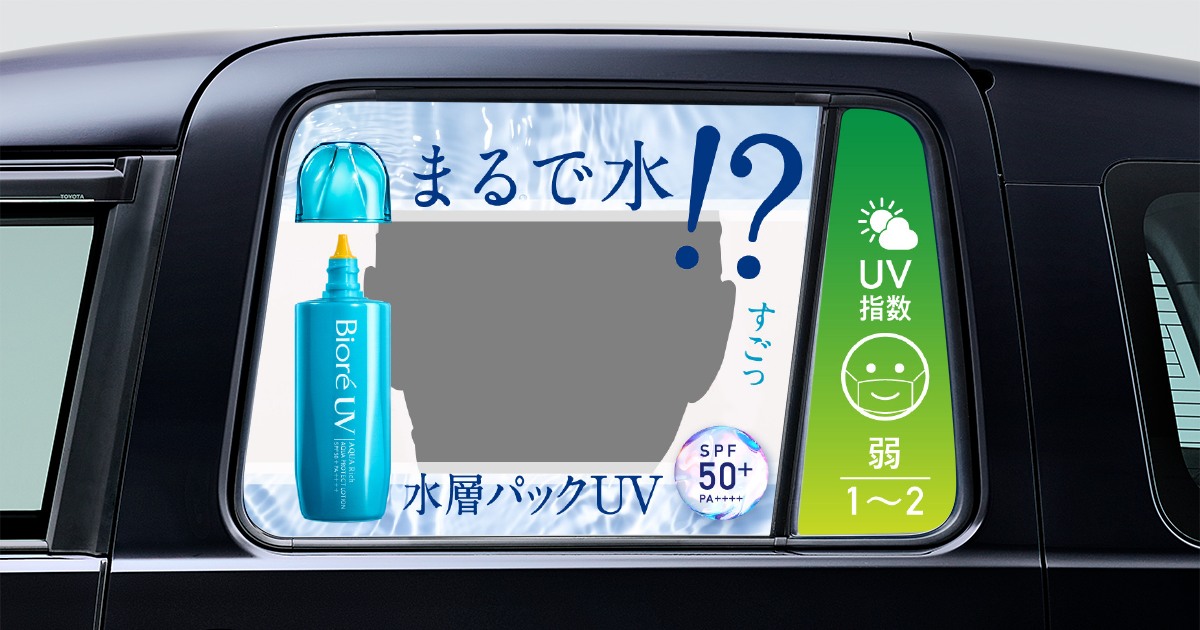「紫外線情報」には、WxTechサービスの1kmメッシュの「紫外線予報API」を用います。紫外線状況を弱(指数:1〜2)、中/強(指数:3〜7)の2段階で表示し、紫外線状況に応じた広告クリエイティブを日替わりで掲出します。また、車内でも商品動画を放映する他、対象車両に乗車した女性限定で「ビオレUVアクアリッチ アクアプロテクトローション(通称:水層パックUV)」の試供品を配布し、歩行者だけでなくタクシー利用者に対しても紫外線予防を呼びかけます。